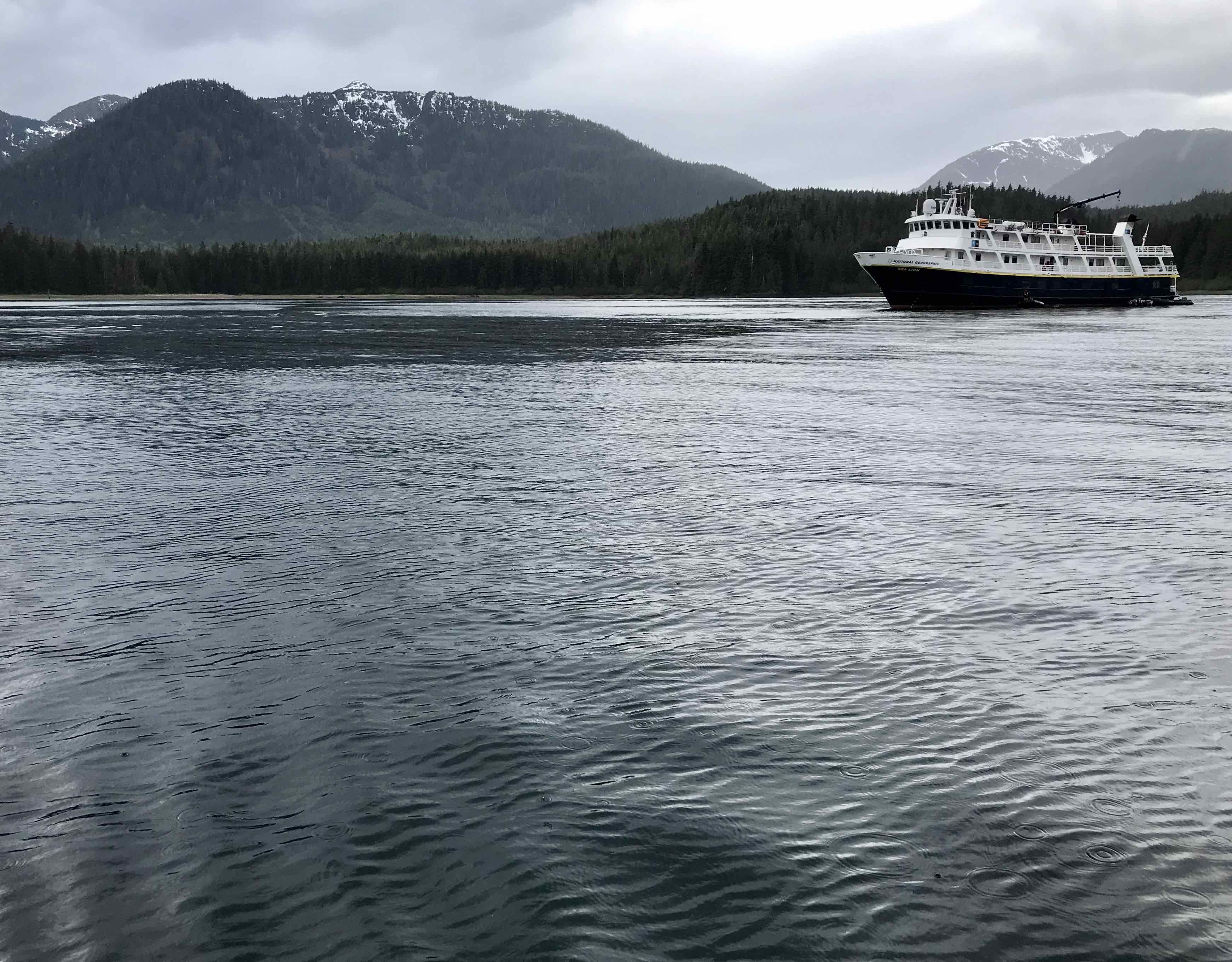 There is a special briskness to waking up at sea that you can’t find anywhere else – the motion of the waves lilting under the bow as you peer over the rail, the air cutting through any lingering fog from sleep. As we snoozed last night, the bridge team guided us carefully through Sergius Narrows and Peril Strait, leaving Baranof Island behind. Chichagof Island greeted us with some uncannily calm and clear weather as we cruised up Chatham Strait. After some brilliant photography in the morning light, our morning was spent learning the intricacies of bear safety, dressing for drizzle, and tactical intertidal footwear. We discovered quickly that we shouldn’t get too comfortable, however, as a humpback whale lounging near shore brought us all out on deck part way through the photography lecture.