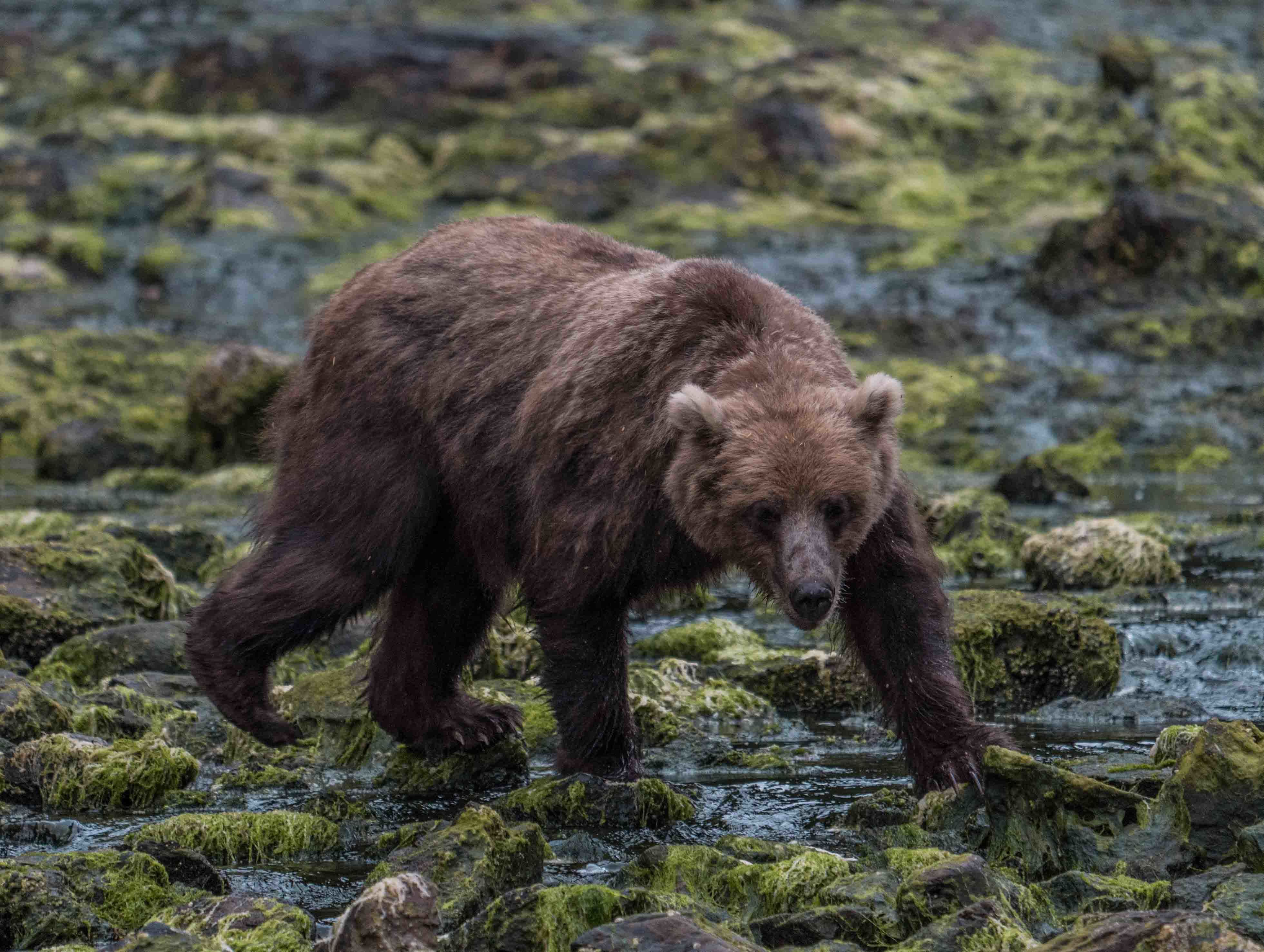 One of the most strikingly unique aspects of the Alaskan wilderness is the connection between the land and sea. Over the past few days we have encountered whales swimming alongside the trees of the temperate rainforest and salmon making their way against the current up to their natal freshwater streams. Today, we woke up early to get a glimpse at one of the animals that directly links these ecosystems: bears. The coastal brown bears that live here in Alaska eat hundreds of salmon over the course of a summer, and in doing so, take nutrients from the ocean and fertilize the forest floor. So, we decided to explore the shores of Pavlov Harbor on the east coast of Chichagof Island to get a glimpse of this phenomenon ourselves. Here, guests patiently sat and waited in silence along the edge of a rushing waterfall and were eventually treated to an up-close encounter with an adult brown bear actively feeding in the stream. Later in the day we continued our explorations of Chichagof, this time by kayak, stand-up paddleboard, and bushwhack hike, in an area called Iyoukeen Cove where we ended our exciting day in Southeast Alaska with a different perspective of the land-sea connection.
