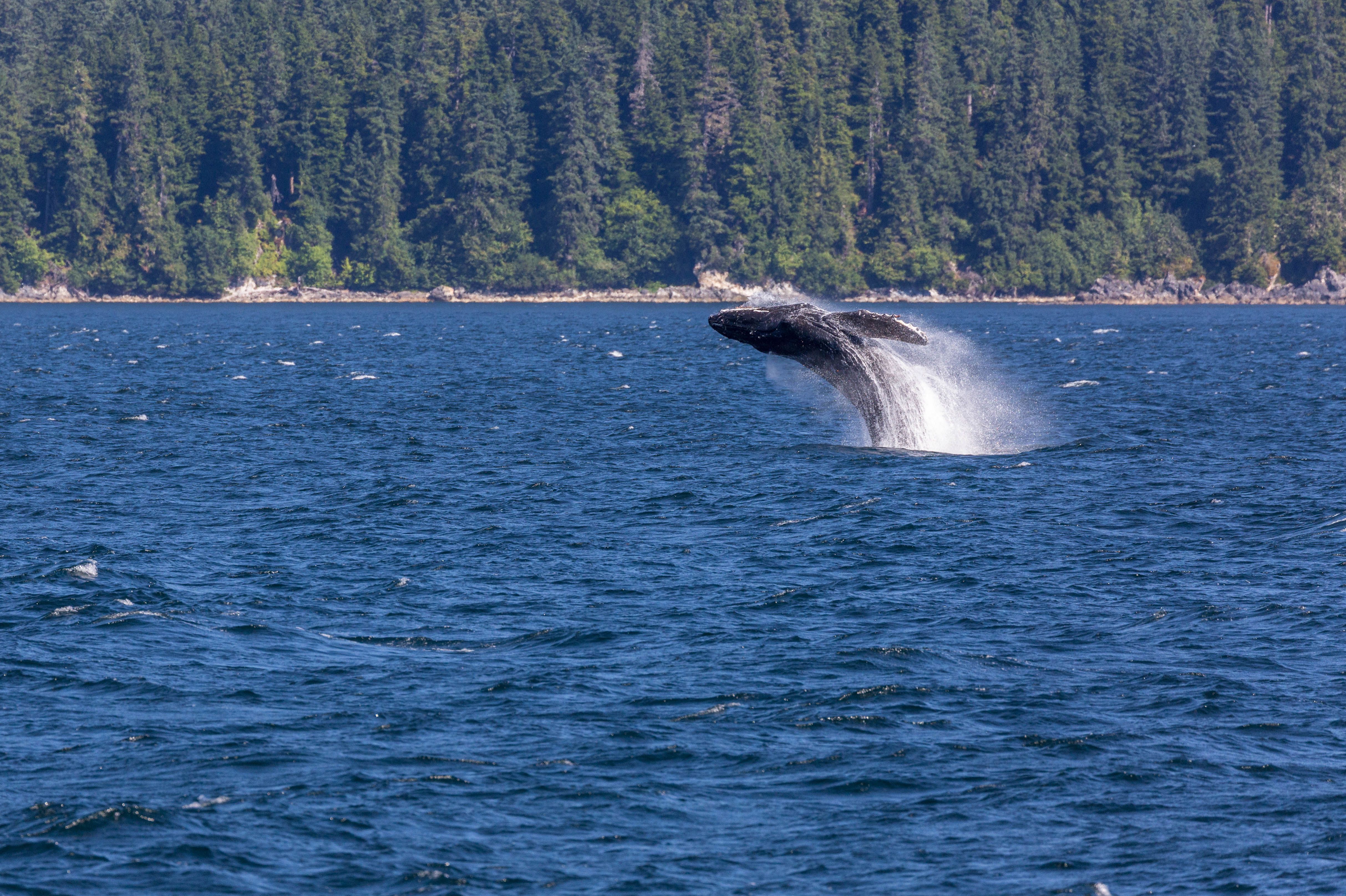 After a steamy frothy espresso and some toe-touching with our wellness specialist, our blood was flowing properly, and we were ready for another day in the Great Land. Diners were joined for breakfast today by a humpback whale cow and calf engaged in restful “logging” activity, setting the stage for a serene morning sail. They turned out to be the first of many majestic M. Novaeangliae we would encounter, most being much more active. We soon found ourselves approaching Morris Reef, and surrounded by not one, but two groups of humpbacks engaged in cooperative bubble-net feeding behavior! We spent time with both pods, viewing and photographing many spectacular lunges, with up to nine of these leviathans’ gaping maws breaking the surface simultaneously and in tightly choreographed formation. Our Global Explorers were then given an opportunity to receive Zodiac driving lessons from our USCG-licensed captains. All souls returned. We continued into the storied seven-mile-long Sitkoh Bay. Here we hiked an old logging road; amongst towering Sitka spruce, frequent bear signs, black-tail deer, and banana slugs galore! Once the wind abated, we also had the opportunity to launch our kayaks and enjoy a leisurely paddle in the bay, with views of National Geographic Venture , bald eagles, and an early 1900s cannery sight. At the end of the day, the ship embraced our return with cocktails, charcuterie, and conversation. A typically highly succulent dinner was followed by a night-capping presentation on birds of the region from our resident ornithologist.