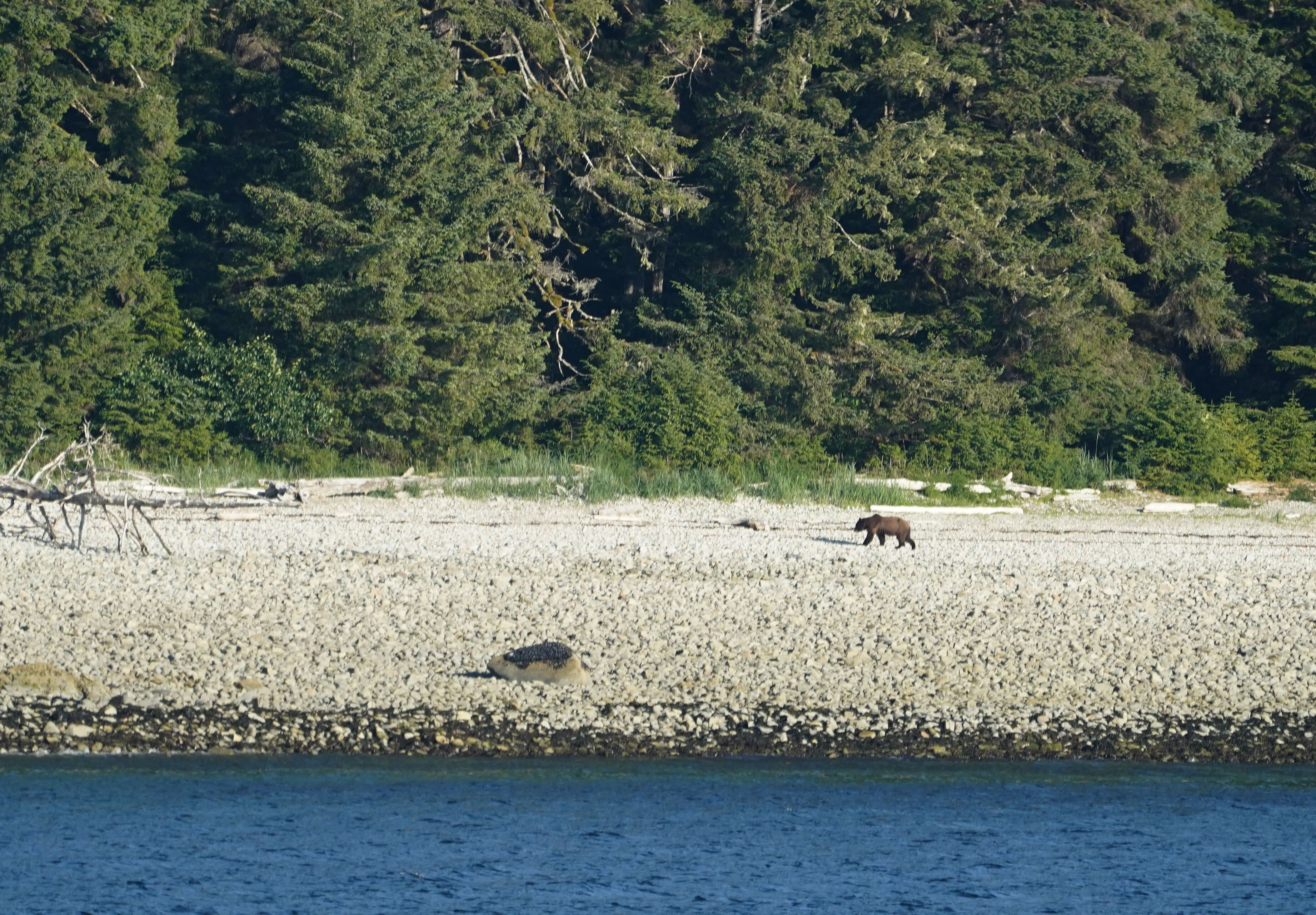 The sun barely sets right now in Southeast Alaska, and quite a few people were on the bow of National Geographic Quest before 6:00 a.m. It is often said, the vigilant on the bow are rewarded, and before breakfast this morning, we saw a brown bear, a couple Sitka black tail deer, Dall’s porpoises, and humpback whales. After breakfast, we had several briefings, but we were interrupted by a group of humpback whales near the shore. In the afternoon, everyone had the opportunity to set foot in the Tongass National Rainforest for the first time. Guests went kayaking, and a few enjoyed a beach walk. It was a pretty amazing first day for our expedition.