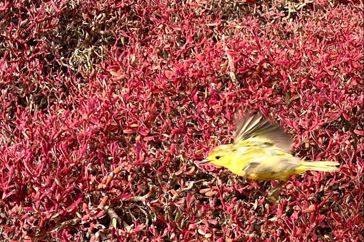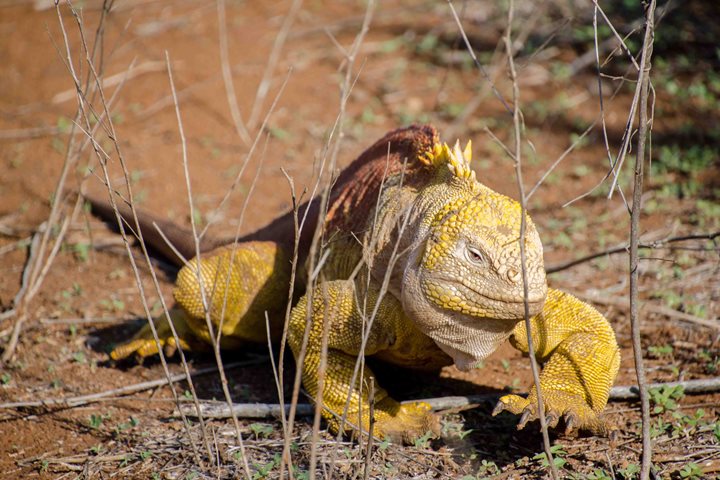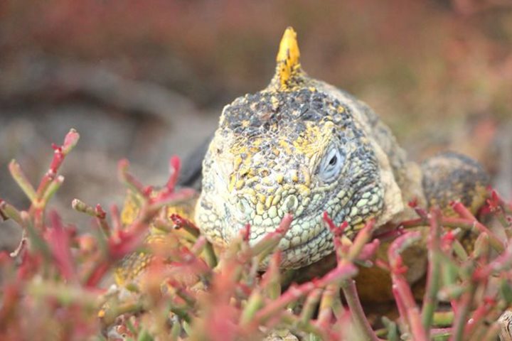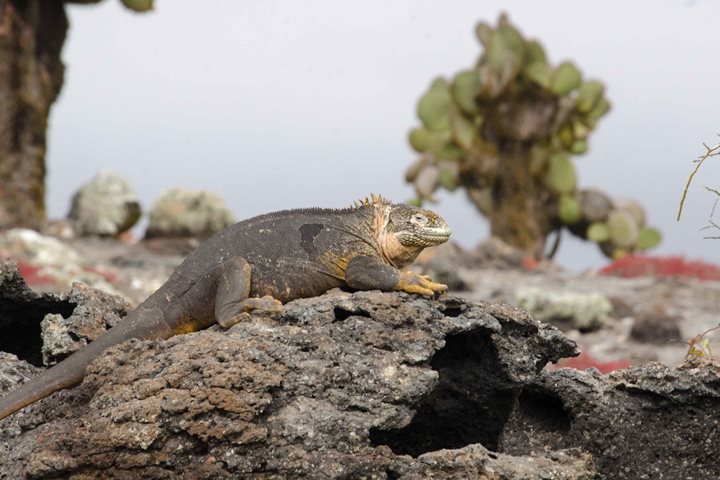 This morning, National Geographic Islander guests visited South Plaza Island. The coloration of Sesuvium sp is perfect against the deep blue of the ocean. The rocky trail–home to swallowed-tailed gulls, lava lizards, and marine iguanas–led us to the rocky shore. We found a big colony of Galapagos sea lions playing along the coast. In the afternoon, Santa Fe Island offered us the chance to observe unique species like the Santa Fe land iguana, which is quite different from the Galapagos land iguana. Santa Fe land iguanas are not only bigger in size, but much more of a pale yellow in coloration. A boulder trail, surrounded by a dense forest of treelike cactus called Opuntia, ended at a white sand beach crowded with a colony of sea lions resting at sunset.