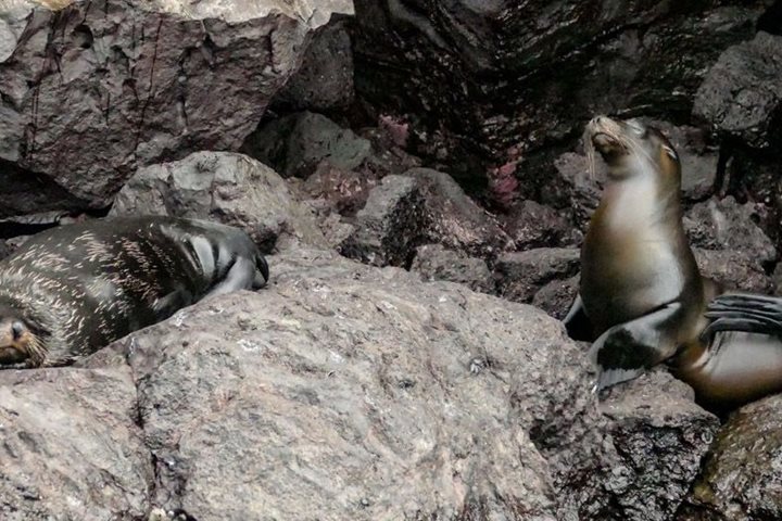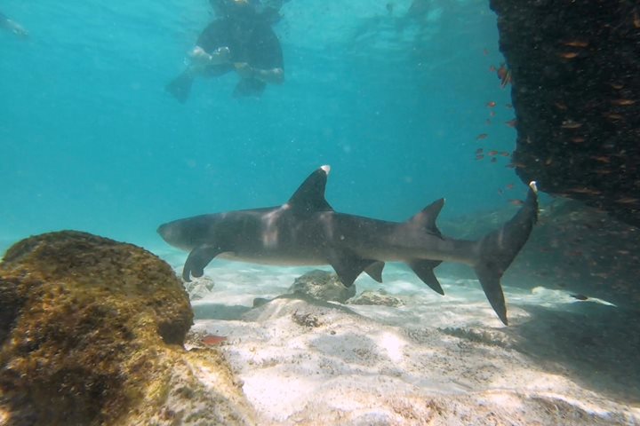 Today we woke up at Chinese Hat in Santiago Island. Some guests went for a pre-breakfast stretch class in the nearby beautiful sandy beach. After a delicious breakfast, we disembarked for a Zodiac ride, followed by a snorkeling session along the shore of Santiago Island. The great visibility today allowed us to see plenty of wildlife, including Galapagos penguins, sea lions, whitetip reef sharks, and many other species of fish. In the afternoon while some guests went for a walk on Sullivan Bay’s lava flow, others took a second snorkeling opportunity in the hopes of seeing a group of penguins wandering along the coast. We ended the day on the sky deck of National Geographic Islander appreciating the sunset while wine tasting.