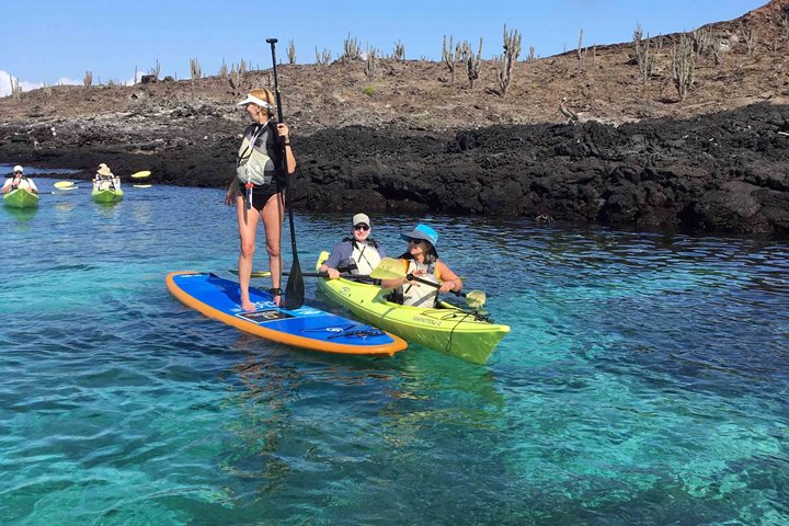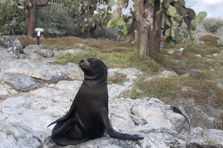 Today we visited the small islet of South Plaza for an excellent opportunity to spot Galapagos land iguanas, and after lunch, sailed south to Santa Fe Island for some kayaking and hiking. We hesitated to leave the inquisitive sea lion pups we encountered after our wet landing to move further inland. This decision proved fruitful though, as we saw many rare Santa Fe land iguanas basking on rocks along our trail, and even the very elusive “hamster-like” Santa Fe rice rat.