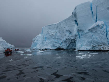 As pleasant and serene as it is out here, the fact that the National Geographic Orion seemed to depart, leaving us quickly behind was mildly concerning. But exploring with experience means someone usually knows what we’re doing and our expedition leader Shaun Powell takes us through the creatively named Hidden Passage, a narrow and very shallow channel flanked by icy cliffs. On the chart this appears to be one continuous section of land, which certainly would confuse anyone trying to track us by GPS. Crabeater seals hauled out on the ice seem genuinely surprised to see us in this secret shortcut, a sensation most share when they see our amphibious hotel staff handing out hot cocoa under a blue umbrella on the other side.