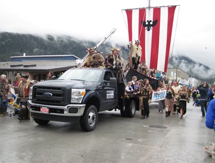 Today was Norwegian Constitution Day, and we lucked out as there were a great amount of activities to be enjoyed, including a great parade! We saw many children dressed in the Norwegian clothes, and a Viking ship, filled with noisy tremendously dressed Vikings, with horn helmets and all. Blond Viking girls were to be seen everywhere also! Many games were played, and noise was the name of the day, as even a helicopter with the American and Norwegian flags buzzed the town.