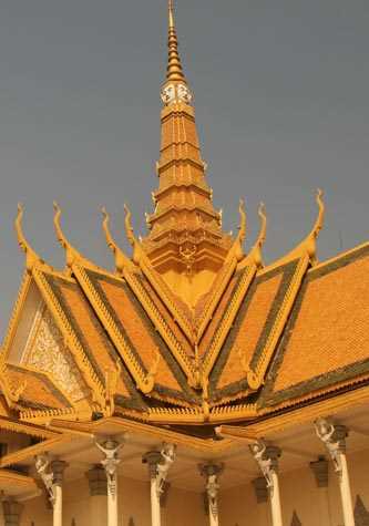 After 20 minutes being chauffeured on a bicycle, we stopped outside the Royal Palace for a guided tour around the magnificent structures, including the highlight—the Silver Pagoda. According to the blue flag, the king was in residence and many were disappointed that he did not come out to have a cup of tea with us.