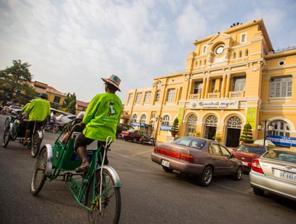 We ride to the Post Office with its French colonial architecture then proceed to Wat Phnom, regarded as the place of foundation of the city, and the sacred hill that gave its name to the capital of Cambodia. Passing by the American Embassy, we circle the Central Market and continue on Sisowath Quay to the Royal Palace. Beyond the outer walls of the Palace, a multitude of buildings, from ceremonial rooms to funeral stupas, are surrounded by green gardens. One of the most exquisite is the Temple of the Emerald Buddha, also known as the Silver Pagoda as its floor is made of 5,329 handcrafted silver tiles.