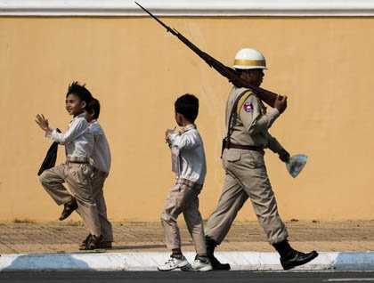 On the riverfront, an army of cyclos is awaiting! These pedal-powered local transports are an ideal way to navigate the traffic while being close to the action. From the quay, we cycle past the Post Office to the sacred hill of Wat Phnom which, according to the legend, is the foundation place of the city in the 14th Century. Soon after, we pass in front of the heavily fortified embassy of the United States before circling the yellow, futuristic central market with its art deco architecture from the 1930s. We then return to the riverfront and finish our adventurous ride in front of the Royal Palace of Cambodia. We arrive just in time to assist to the change of the guard, under the giggles of visiting schoolchildren.