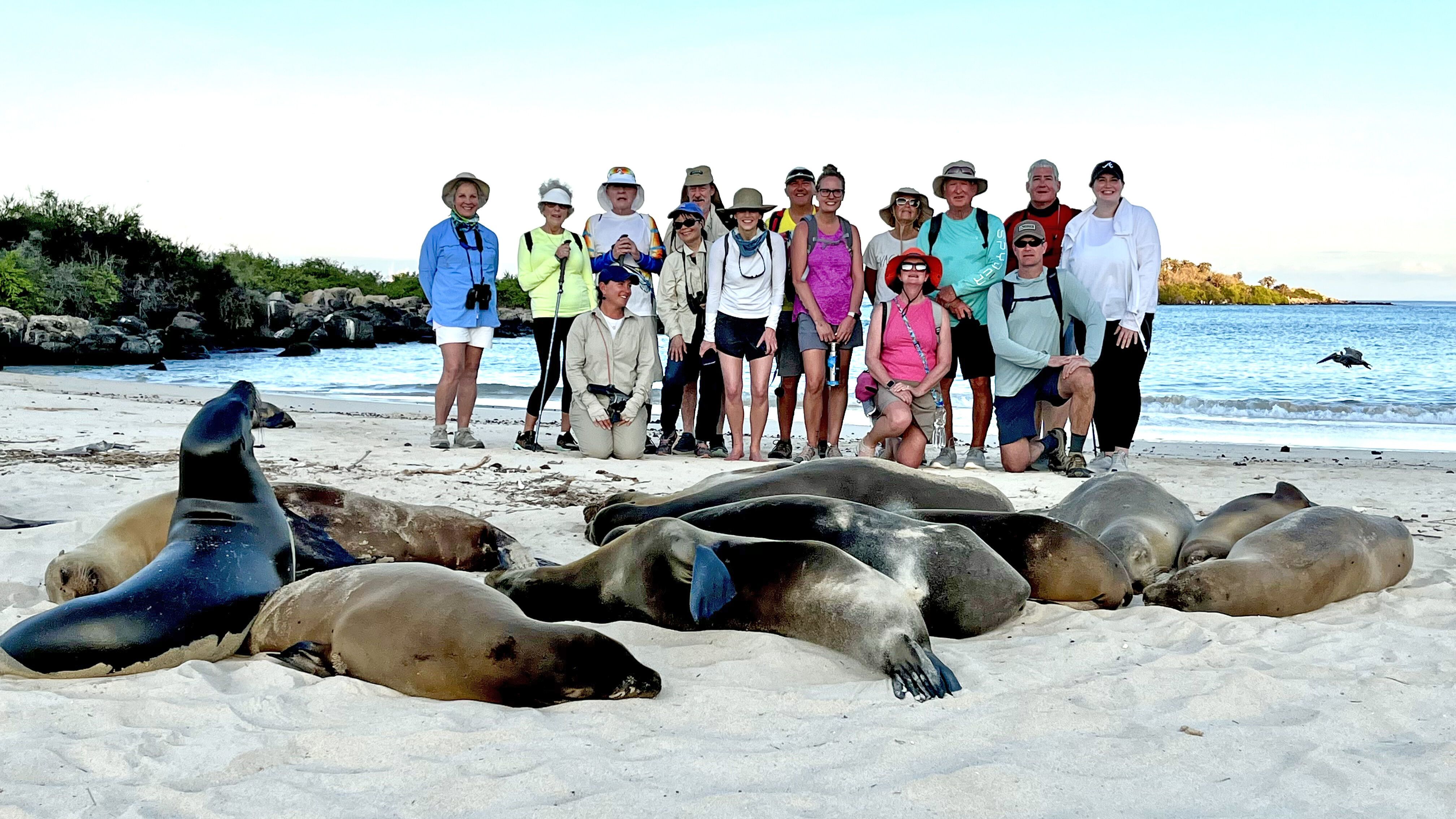 After lunch, we explored Santa Fe Bay, a fantastic spot with turquoise water that is home to many marine creatures. Some of our guests kayaked around the bay, and others took the opportunity to snorkel. We found sharks sleeping on the seabed, a large aggregation of eagle rays, many green sea turtles moving around the bay, marbled rays, diamond stingrays, playful sea lions that performed in front of us, and a variety of multicolored fish. What a great experience for our guests, who enjoyed close encounters with creatures that are tame here in the Galapagos. In most areas of the world, animals run away from humans; here in this archipelago, the fauna is ecologically naive.