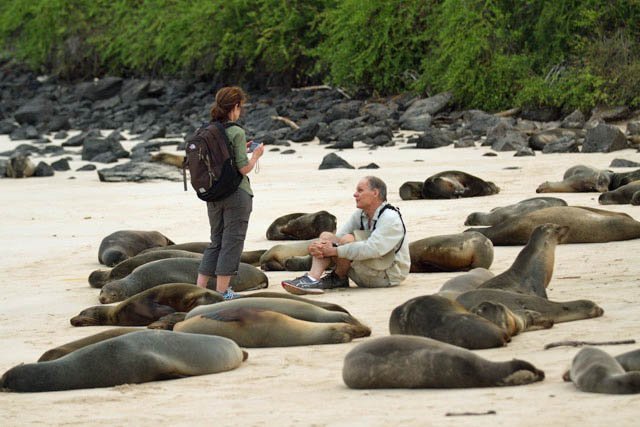 Relatively small and low compared to neighboring Santa Cruz, North Seymour is located to the north of Baltra. The island is dry with predominantly low shrubs, like prickly pear cacti. The incense trees are bare during the dry season. Seabirds like frigatebirds and blue-footed boobies nest on the island, and sea lions rest on the sand when they are not fishing. Land and marine iguanas also live here. Rabida is in the middle of the archipelago and has a striking red sand beach. We observed a small colony of sea lions of all ages resting or nursing. Behind the beach, American flamingos nest in a brackish lagoon. This island is full of contrasts and wildlife that we enjoyed observing during this day of expedition.