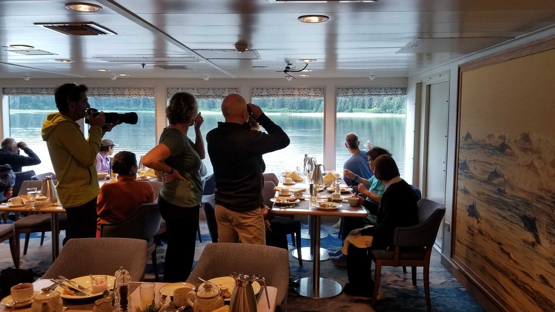 As the morning ended, we returned to National Geographic Venture to refuel with a fantastic lunch. As we ate, the ship hauled anchor and moved to the Inian Islands. At the northernmost entrance of the Inside Passage, the massive tidal swings create immense currents. Locals refer to the area as “The Laundry,” a nod to the washing machine effect created by the deep currents slamming into the steep islands. Wildlife gathers for the current, driving fish and food to the surface, where they are trapped in whirlpools and become easy pickings.