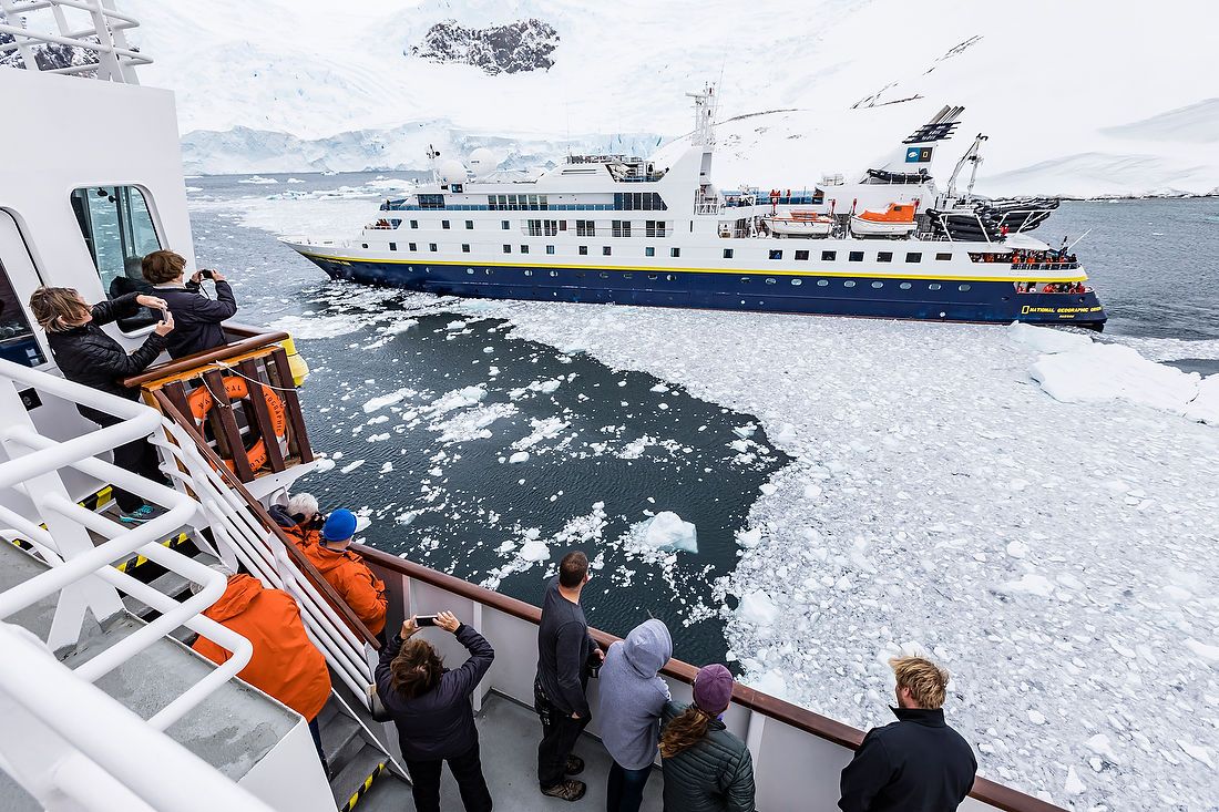 Back on board the ship we cruised to Neko Harbour, where we met up with our sister ship the National Geographic Orion for an exchange of some much-needed items, we got additional life vest cartridges and they got hand soap!