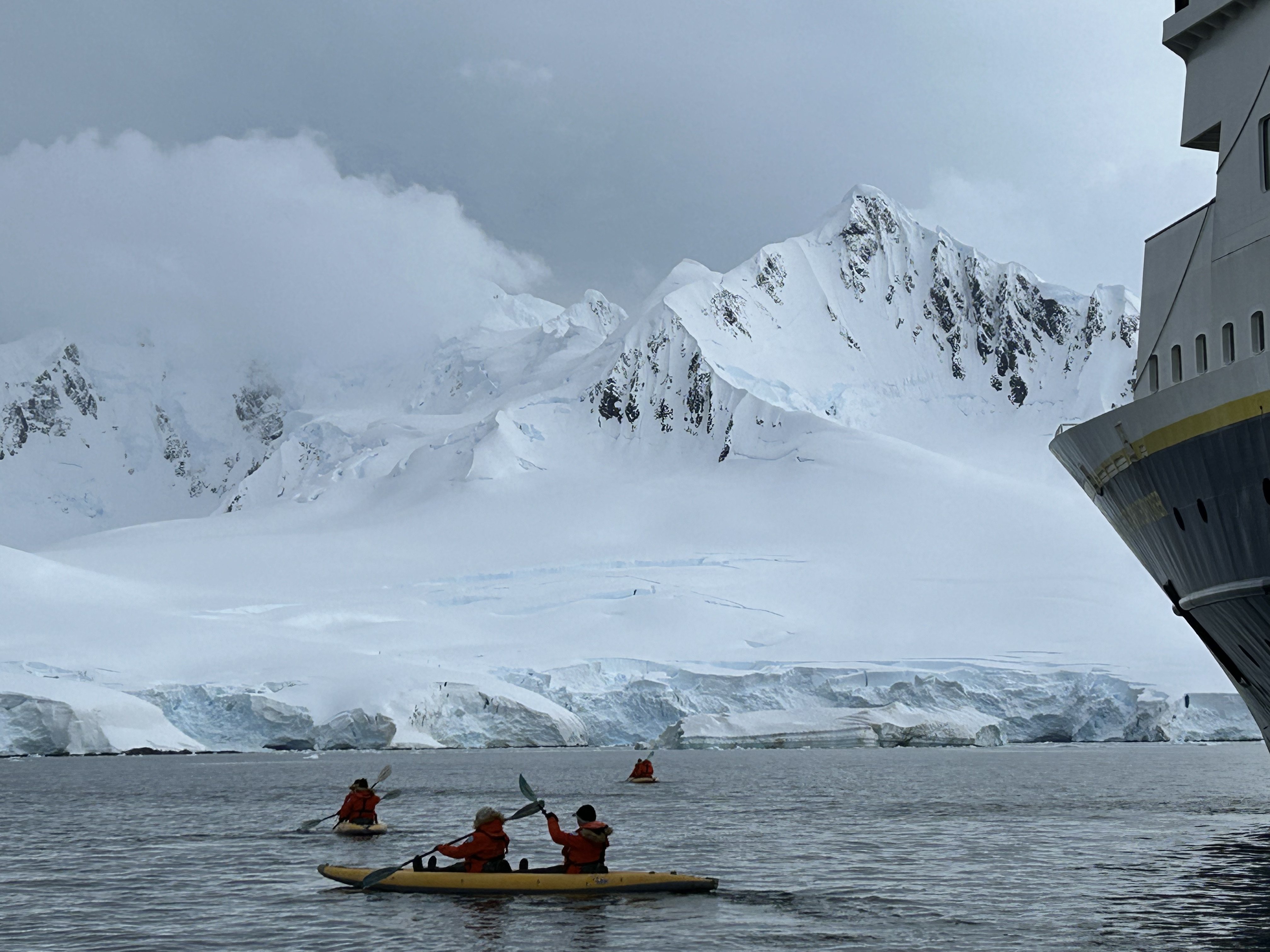 During the afternoon, we headed west into Borgen Bay. The bay is located to the east of Anvers Island, and it is surounded by high mountains that protected us from the wind in all directions. The water was flat and calm, which allowed us to set up kayaks and go for a paddle. The crew of National Geographic Explorer made boarding the kayaks easy for us. We moved from the ship to a Zodiac, and from a Zodiac to a kayak. We paddled for about an hour in the calm and frigid waters of Antarctica. We were able to get closer to the brash ice and take photos from a different perspective. Next, we did a Polar Plunge from a Zodiac attached to the side of the ship. Many of us decided to just observe those brave enough to carry out this crazy ritual. What a great way to finish our fantastic day in this amazing area.