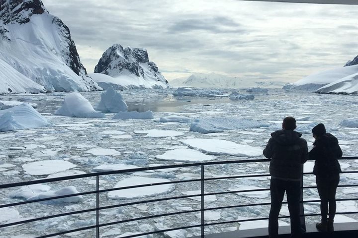 Marguerite Bay is an extensive bay on the west side of the Antarctic Peninsula, which is bound on the north by Adelaide Island and on the south by Wordie Ice Shelf, George VI Sound, and Alexander Island. During the afternoon, we explored the inside of this bay looking for fast ice for a possible Ice walk. We sailed passed Nemo Cove, Nautilus Head, and Ridge Island. Right after lunch, the great news came over the PA system: “We found the perfect spot!” Approaching the ice, we could already sea dozens of seals on this vast frozen sea water fastened to the shore, hence “fast ice.” The National Geographic Resolution approached the ice in the most gentle and smooth way—and without even feeling a bump, there we were, surrounded by ice. It was unbelievable. Our penguin doors at the bow of the ship opened, and we got to explore this immense ice landscape surrounded by high peaks of mountains and magnificent glaciers.