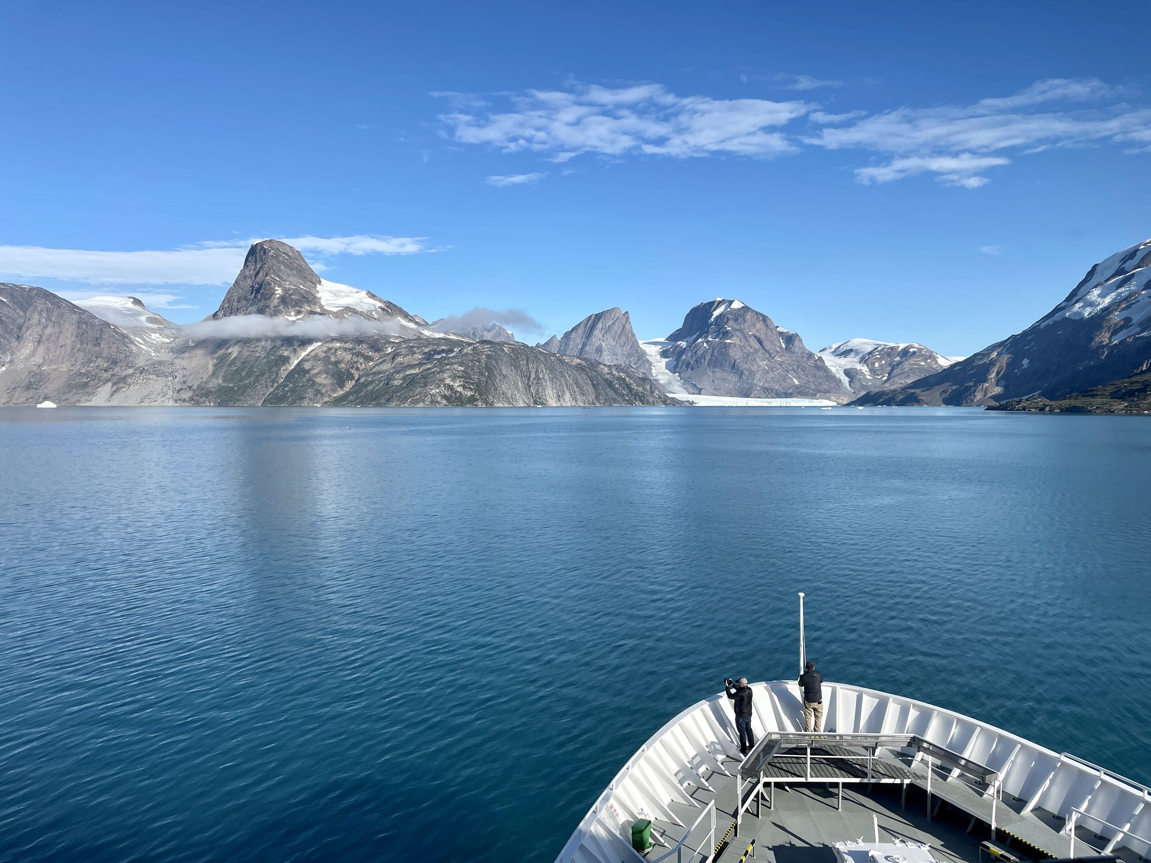 We awoke to a beautiful, sunny morning as we approached Prins Christians Sund (Ikerasassuaq). The large icebergs surrounding us before entering the fjords had traveled from the Eastern Greenland ice sheet. The smaller icebergs encountered throughout the fjords were from tidewater and valley glaciers within the fjord system itself. We were surrounded by towering mountains and glaciers as we sailed through, heading from East to West Greenland. The wind subsided as we entered the narrowest part of the passage, and we enjoyed beautiful views of the rocks and ice.
