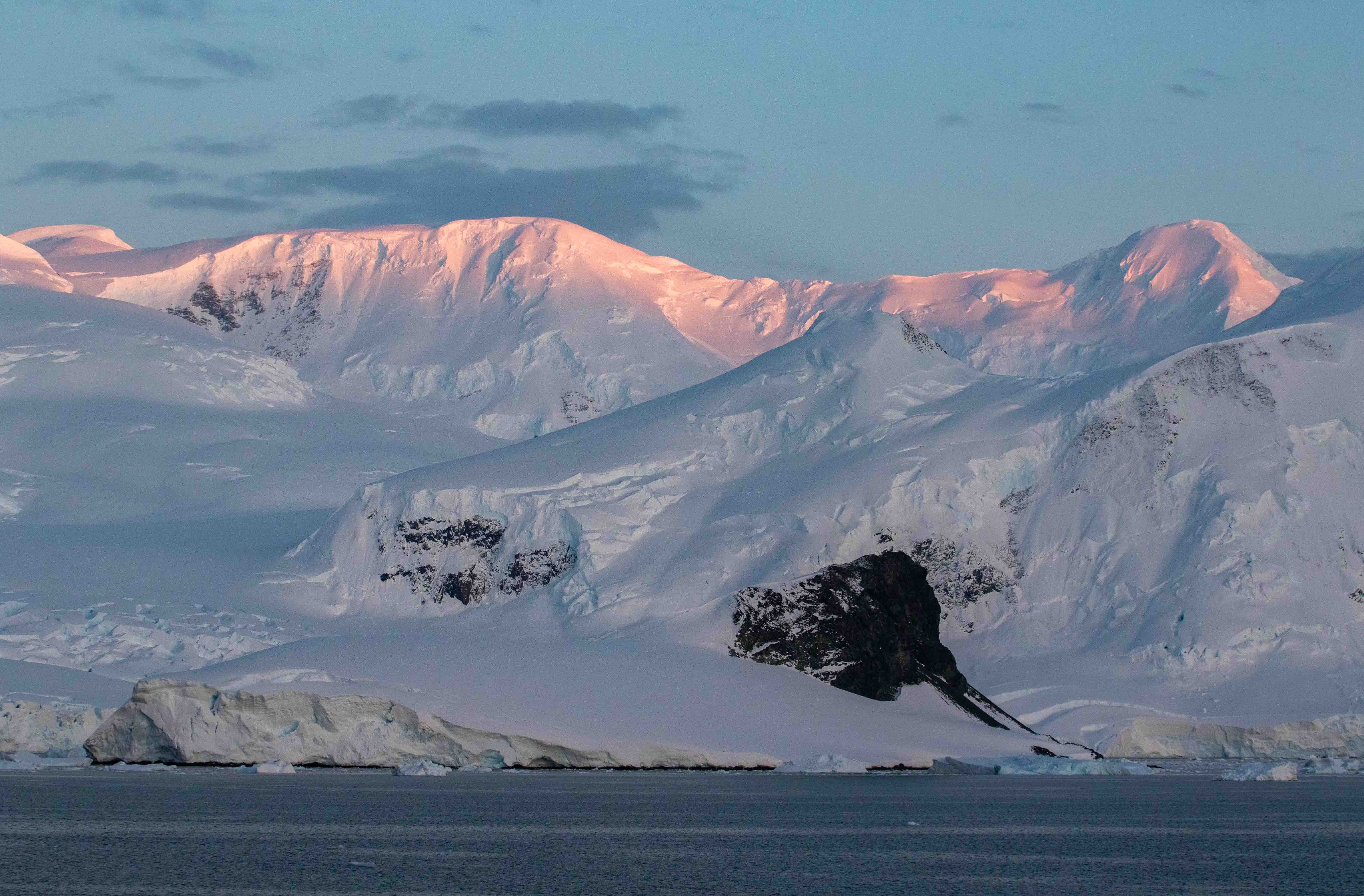 We started the day with stunning light as National Geographic Endurance navigated towards the mouth of the Gullet. This narrow passage offered spectacular views as the sun painted the mountaintops orange and then pink. As we exited through the glacial brash ice into Crystal Sound, blows of humpback whales rose in the windless morning air.
