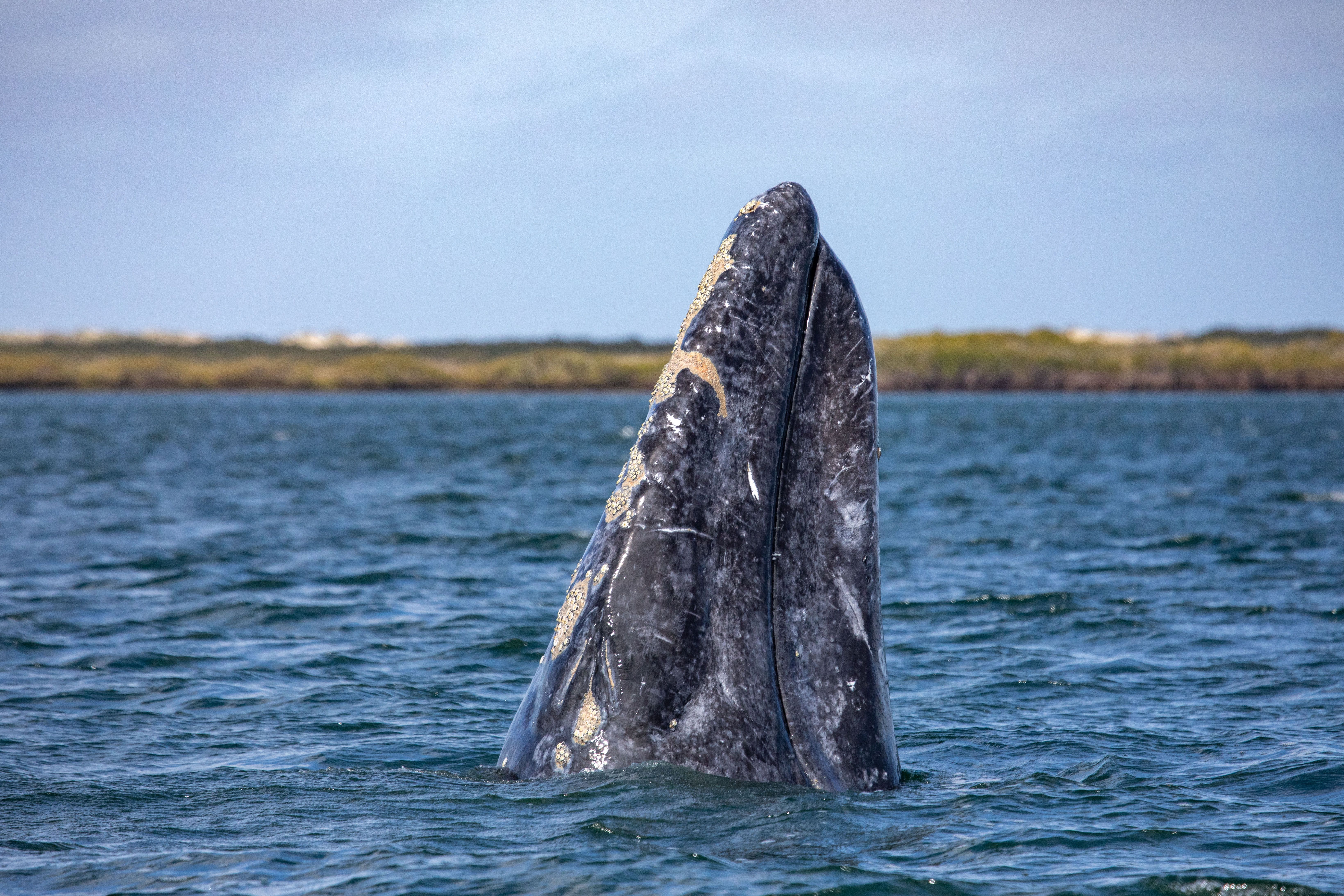 Today was our first full day exploring the waters surrounding Puerto Adolfo Lopez Mateos. This morning, we explored south of our anchorage and encountered several mom and calf pairs of gray whales in these protected waters. Other special wildlife encounters included a coyote on the beach, dolphins surfing the wake behind our pangas, and a bald eagle perched on the dunes of Isla Magdalena. After a break for a delicious lunch, we headed back out to explore north of our anchorage. We pulled into the calm waterways of a mangrove forest and sighted a wide diversity of bird species and even an oyster farm run by a local fishing cooperative. Single whales swam around us here and there as we returned to National Geographic Sea Bird. A special cocktail hour awaited us on the shore, complete with a campfire and s’mores. We shared stories of the day and watched the sky erupt in flames of color during sunset – the perfect ending to the day’s adventures!