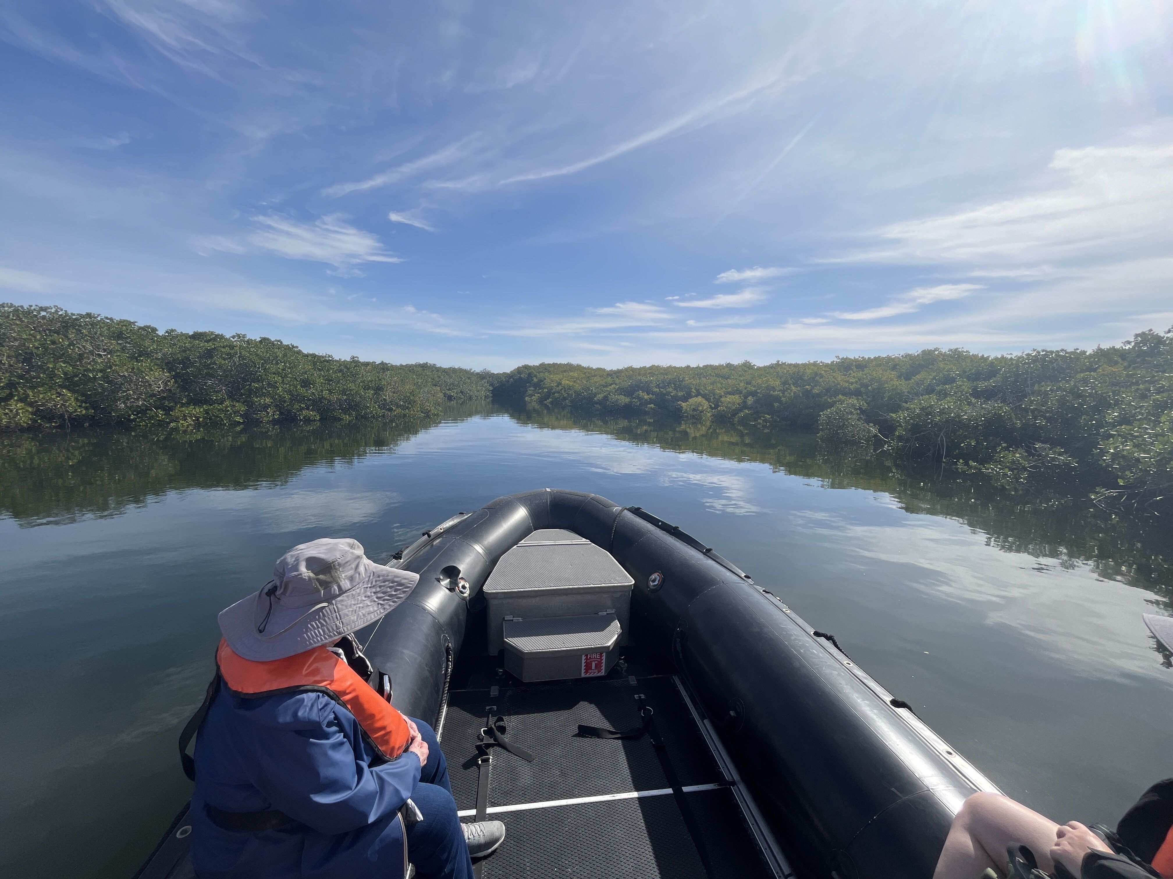 In the afternoon we anchored in Puerto Balandra on Isla Carmen, in Loreto Bay National Park. This pretty little crescent-shaped bay was the site of our activities. We snorkeled along the rocky coast and saw large flounders, an octopus, lots of wrasses, sea stars, and pufferfish. Our undersea team went scuba diving and recorded video footage to show everyone more of the underwater world. Later we enjoyed casual, moderate, and long hikes through the wide dry arroyo that leads from Puerto Balandra to the other side of Carmen. We saw Xantus’s and Costa’s hummingbirds, yellow warblers, black-throated sparrows, blue-gray gnatcatchers, spiny lizards, black mangroves, California ruellia flowers, and flowering Adam’s trees. We also heard stories about the Indigenous history of the island and surrounding areas. It was a beautiful and fascinating day!