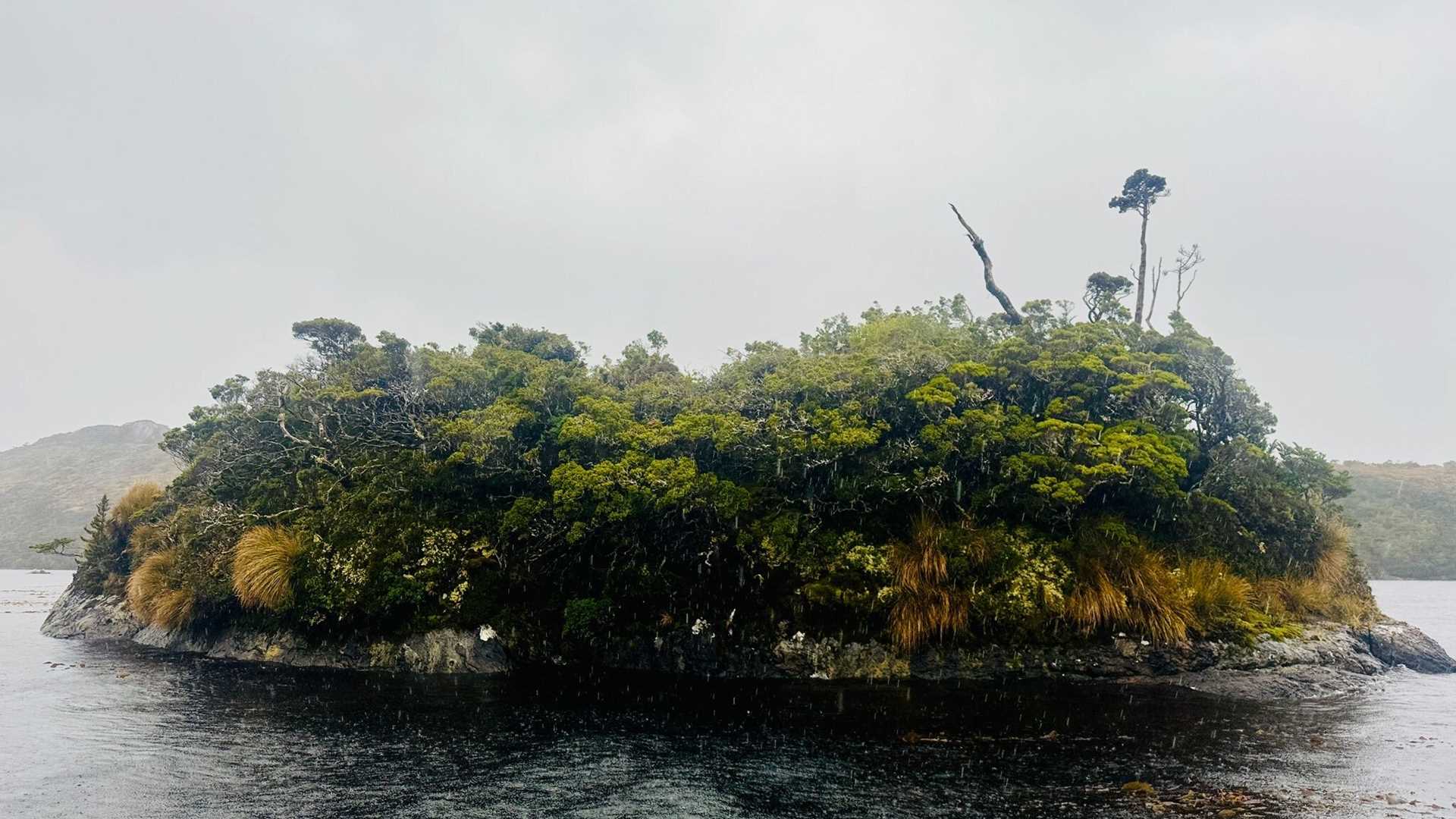 Puerto Profundo opens into a series of narrows and fjords that run north from the Magellan Straits. We awoke there to damp skies with stark green and tan little islets scattered across the dark waters.
