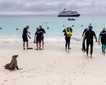 In the afternoon we visited a large coralline beach, with stunningly soft white sand and turquoise waters, to walk and swim along the coast. Then afterward, at sunset, we circumnavigated “Leon Dormido” with margaritas. It was a fantastic first full day of our expedition in the Enchanted Islands.