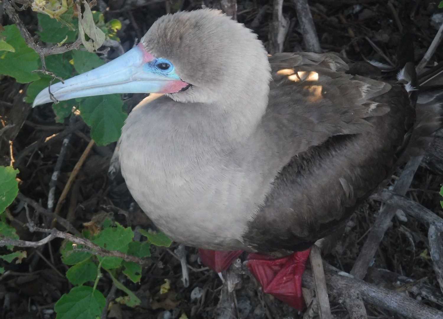 The beach at Punta Pitt this morning, is made out of olivine, incredibly soft green sand, that is the result of eroded particles of the hardest crystals and minerals that make a lava flow. The little beach transported us to an enchanted kingdom, which was completely surreal; the glittered sparkles of crystals seemed to be the result of a fairy flying around here… At the end of the trail, a small colony of red footed boobies surprised us, birds facing the difficult conditions of the season where patiently taking care of the single chick on their nests; perching by itself on an solitary branch we found one fully grown adult with red feet that had to be photographed.