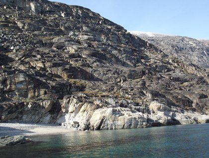 Those of us who were up very early this morning were treated to a wonderful vision of full-moon-lighted icebergs and snow-capped mountains of Greenland. A little later, the vista was changed (neither improved nor degraded, just changed) by additional light from the sunrise. The rest of the morning was spent cruising through scattered gigantic icebergs as we made our way toward our first point of interest in Greenland … Qilakitsoq. This site is a beautiful, protected little bay, backed by a rocky, moss-covered slope that is surrounded by glacially smoothed metamorphic outcrops, which have been dated to nearly 3,000,000,000 years in age! (See Figure A.) Our main reason for coming here, however, was to view the remains of an ancient Thule winter settlement and sacred burial area. At first, it was difficult to make out the actual home sites and burial chambers, since there has been a lot of settling and overgrowth by grasses and mosses since the site was used, but once we were ashore and had a chance to explore among the boulders, they became evident. Qilakitsoq has given us one of Greenland’s most remarkable and important archaeological finds and it was made famous by the February, 1985, issue of National Geographic magazine (Vol. 167, No. 2).
