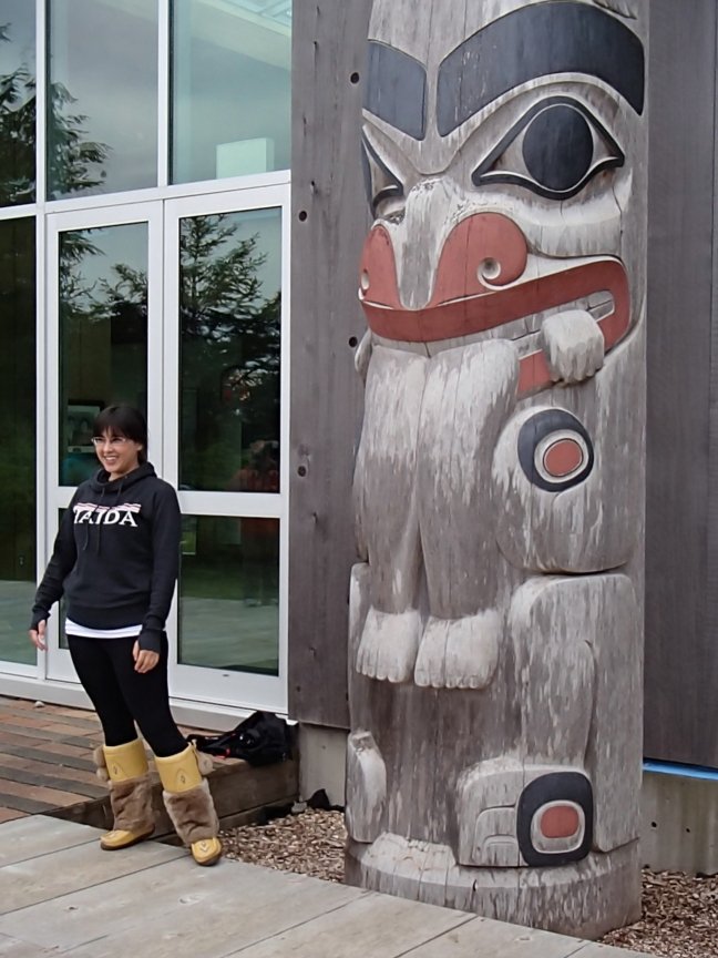 We pulled up to the docks of Queen Charlotte City this morning under high clouds and no wind. At breakfast, we met our local cultural interpreter, Elsie Stewart-Burton, and our local logistics coordinator, Sue Perin, who will both be joining us during our time on Haida Gwaii. They accompanied us on the short bus journey to the Haida Heritage Centre, where we were fortunate to have two remarkable, young Haida guides, Raven and Alex. Raven interpreted the totem poles in- and outside the beautiful building and told us some very entertaining Haida legends. Alex and Elsie shared information about the process of weaving and the ceremonial uses of today’s button blankets. I was very moved by Alex’s story of being presented with her blanket by six of her aunties at her high school graduation ceremony and how that meant more to her than the cap and gown.