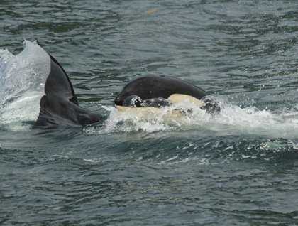 A few hours later our guest speaker Dr. Andy Szabo arrived in Indiana-Jones style by zipping along in his Zodiac from Baranof Warm Springs Bay, the summer headquarters for the Alaska Whale Foundation. For the next hour, as we towed his boat along, he shared his marine mammal research with us. Andy is so passionate about his subject, that he hardly took a breath during the entire fascinating presentation.