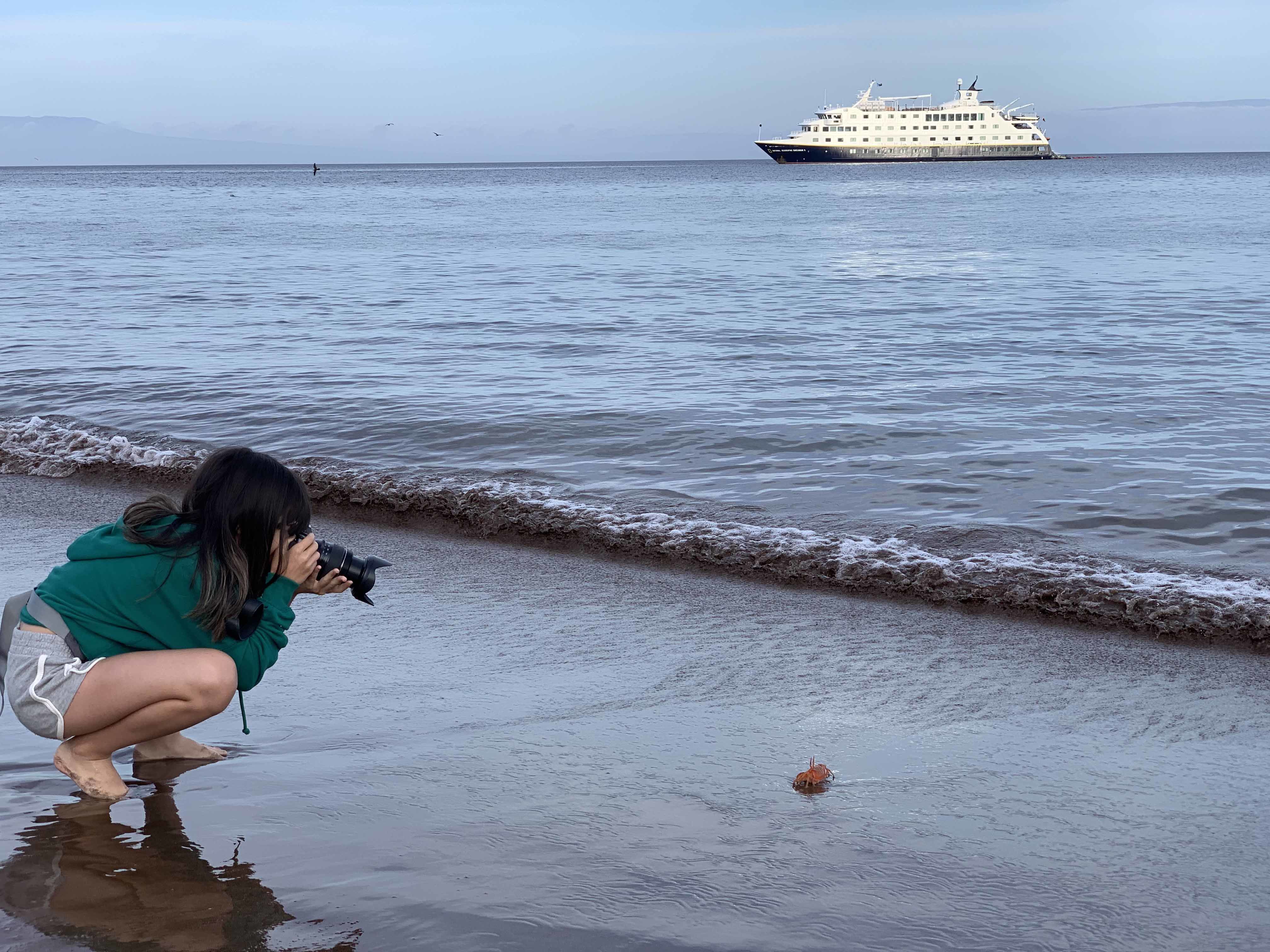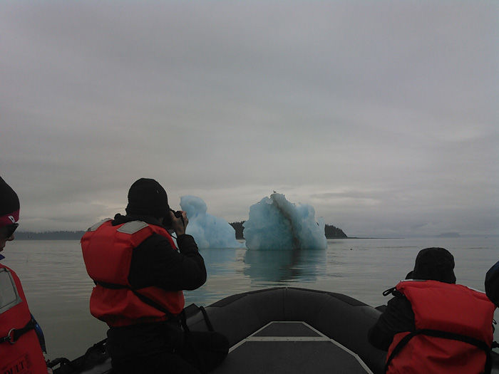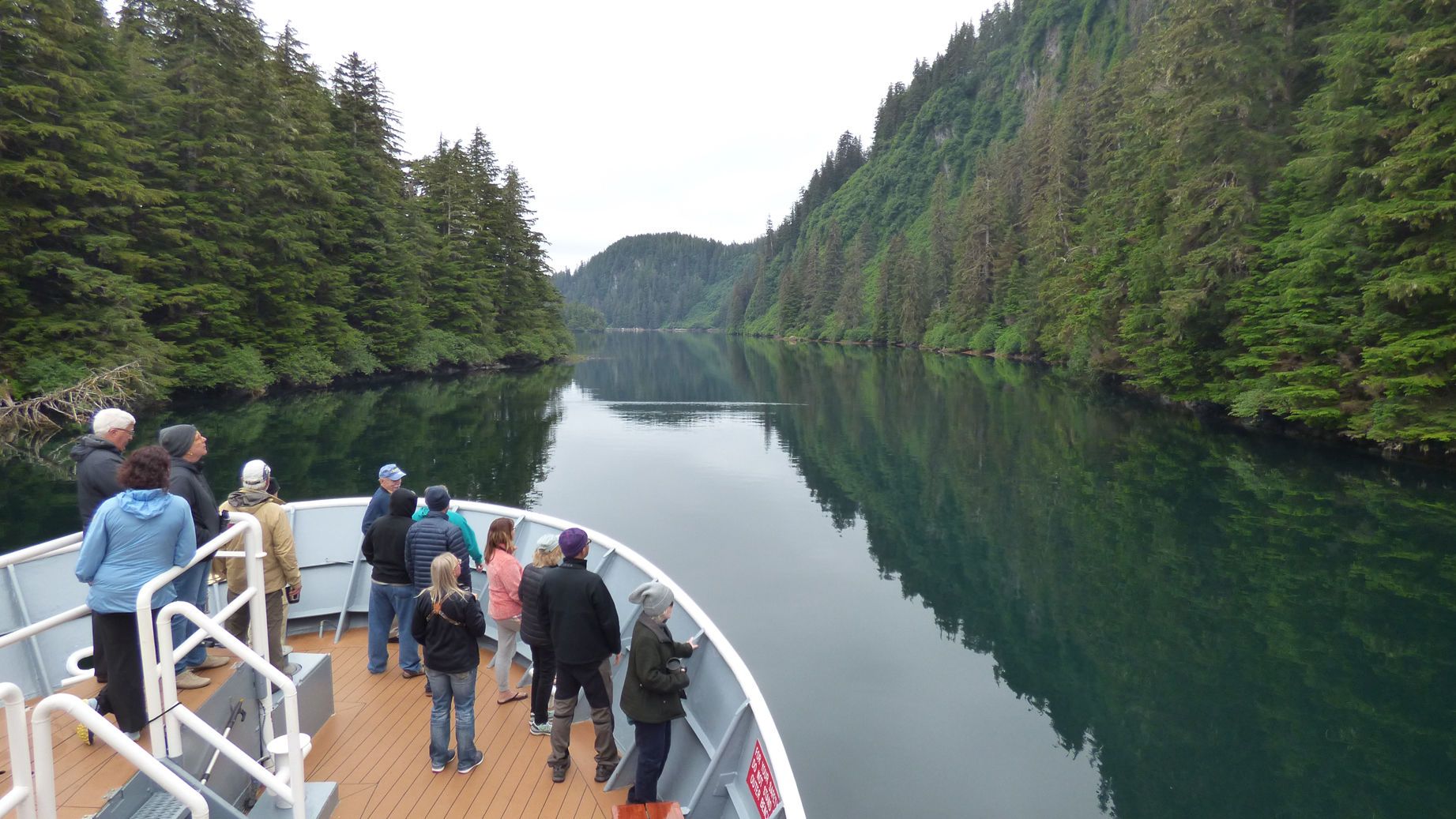 The trees were so near their crisp clean scent surrounded our ship. The water was pure reflection. From our vantage point on the bow, the mountains loomed high above us. We woke as Captain Sinclair expertly guided our ship through the narrow entrance of Red Bluff Bay. Above the trees, clouds obscured the top of the mountains. We felt like we had crawled inside a mystery. Shortly thereafter the bay widened into a secret little cove with a bucolic grassland at the end. Three small boats slept at anchor off to one side. The only sounds were the metallic cascade of the Hermit Thrush’s song and the pounding waterfall. What a waterfall is was. The depth of this enchanted place allowed us to put the bow of the ship almost into the waterfall. Cameras clicked and iPhones held high as David, our photo instructor, offered clues to improve images. Lion’s mane jellies populated the waters with their caressing strides as we exited Red Bluff Bay. Then we were in the wide waters of Chatham Strait. Splashes here and there caught our eyes. Yes, finally the salmon are running. Out of the water they leap. Some leap again and again. As far as you could see, there were intermittent splashes from jumping salmon. Trying to anticipate where they will jump next proved a challenge for the photo minded among us. Then a lunge feeding humpback whale joined the fun. The whale fed close to shore and across our bow for over an hour. Gulls watched from shore and marbled murrelets displayed their prize fish in their mouths not wanting to eat it just yet.