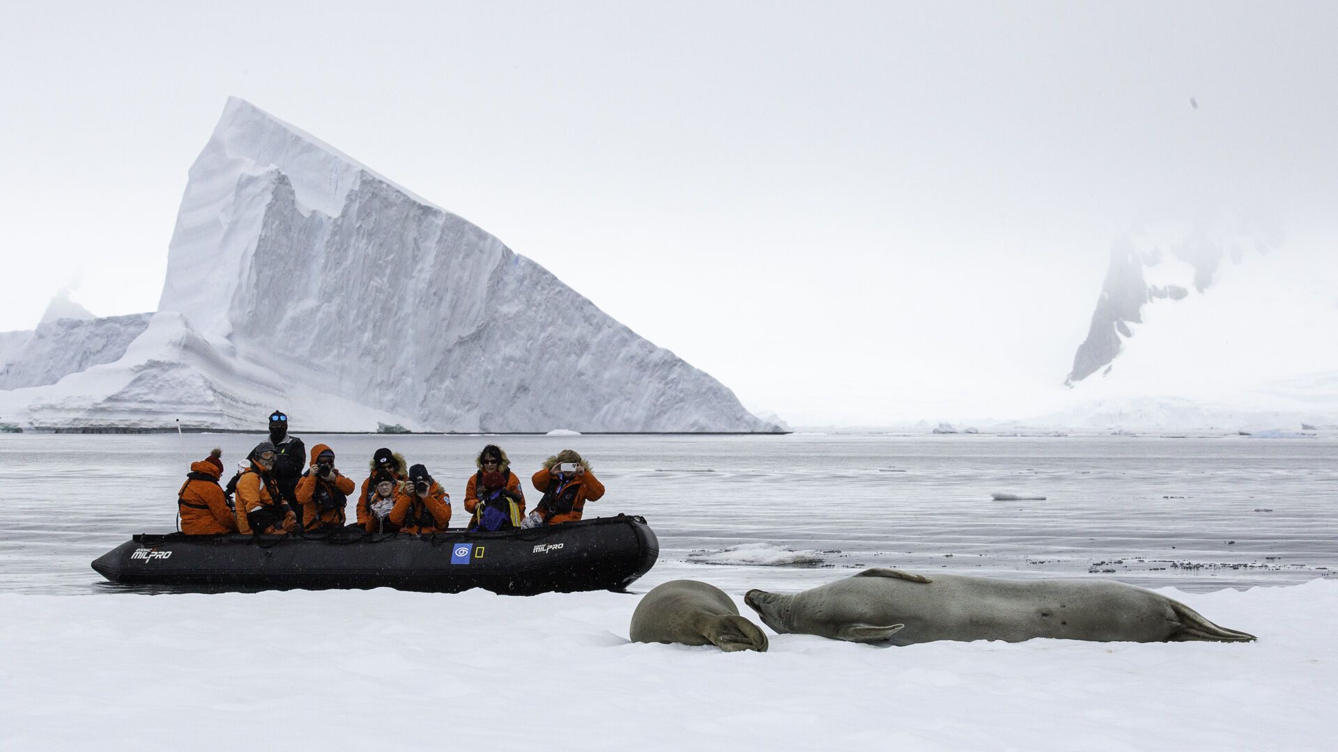 Our second day in the spectacular polar wilderness of Marguerite Bay took us to the coast of the Antarctic Peninsula along its inner, eastern shore. Here, surrounded by jagged peaks reaching up vertically from the icy waters, we found the soaring promontory of pink granite known as Red Rock Ridge and went ashore among the Adelie penguins nesting at its base. The breeding season of the penguins is in full swing with large, fat chicks in the nests and adults busily coming and going with a constant supply of tasty krill. Later in the afternoon, we cruised into nearby Neny Fjord, where we found dozens of crabeater seals and had a glimpse of an emperor penguin far out across the fast ice.