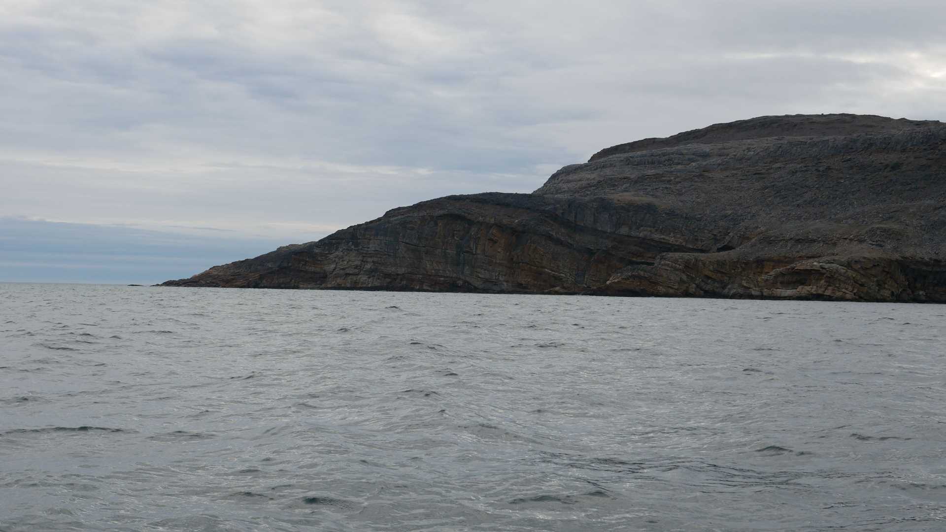 Morning found National Geographic Explorer arriving at Resolution Island, a large and largely barren mass of metamorphic rock southeast of the mouth of Frobisher Bay on Baffin Island. Resolution is the site of a now-decommissioned Distant Early Warning (DEW) Line station; its Cold War era radar dome looms over the island.