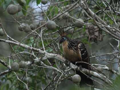 Our afternoon outing was up the Rio Dorado, and our plan was to stay out past sunset and experience the rotation from daytime inhabitants and their associated symphony, to the nighttime denizens and their accompanying cacophony.  Horned screamers were sighted and their pulsing, donkey–like brays echoed through the forest.  The rasping, cough-like sound of a group of hoatzins caught our attention.  It takes a fine-tuned ear, as our local naturalists have developed, to recognize the species of bird you are looking for by the sounds surrounding you.  In addition to the various bird species, a group of monk saki monkeys were found, as well as a small group of squirrel monkeys climbing high into a tree to rest for the night.