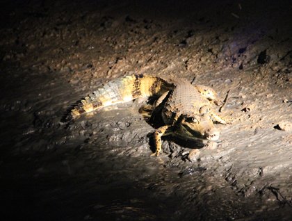 Our final outing of the day was slightly cooler than usual, as there were clouds building in the west, blocking the intense late afternoon sun. Up the Rio Dorado we found avian treasures such as green kingfisher and sunbittern. Some heard the low roar of howler monkeys and undulated tinamou’s called for the closing of the day. Darkness fell and we started our search for spectacled caiman. Many animals were found, some partly submerged and others out on the shore. Their red eye shine gave away their position to our skiff lights. Other lights flickered faintly in the forest, fireflies were blinking amorous messages to each other, and then a larger flash in the sky lit up everyone and everything in silhouette. A storm was on its way and we were still a ways from our mother ship. Ponchos were handed out to all and soon raindrops fell large and warm. The rain then stopped falling and started dumping on us all by the bucketful. Upon our return to the ship a comment was made that this was better than anything Seattle, Washington could come up with.
