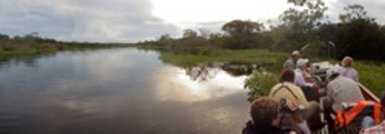 After breakfast we returned to the river and came back with a barrel of monkeys. Well, almost. We started with a troop of saddleback tamarins and then found a couple of the impressive monk saki monkeys; their limp fluffy tail is a great marker as they skulk in the shadows of the canopy. The winner of the paint chips contest was the plum-throated continga, about a robin-sized bird wearing poster paint neon-turquoise. Hard to believe nature can create such brilliance. The radiant red of the lineated woodpecker caught our attentions as it flew from a dead snag, our disappointment with its departure quickly turned around as a female cream-colored woodpecker was on the same tree and stayed put, allowing us wonderful views of her light mustard-colored plumage. With a little skillful maneuvering, our skiff driver penetrated into the flooded forest and brought us to the base of a tree, which was home to a family of night monkeys. They stared wide-eyed at us from the safety of their daytime refuge. Being nocturnal animals, I think they stare at everything wide-eyed. A red blotch was seen swimming in the water, which quickly materialized into an undulating dog-paddling caiman lizard.