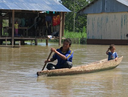 This morning after breakfast we got a firsthand view of yet another reason why canoes are important—many of the towns along the river flood for 3 - 4 months of the year. We visited one such village, Urarinas, this morning. On our visit today we drove our skiff over the top of the soccer field, down the various streets, and stopped to shop for local crafts. One local man came by in his canoe to show us the three-foot-long electric eel he had caught. Nowhere was there dry land.