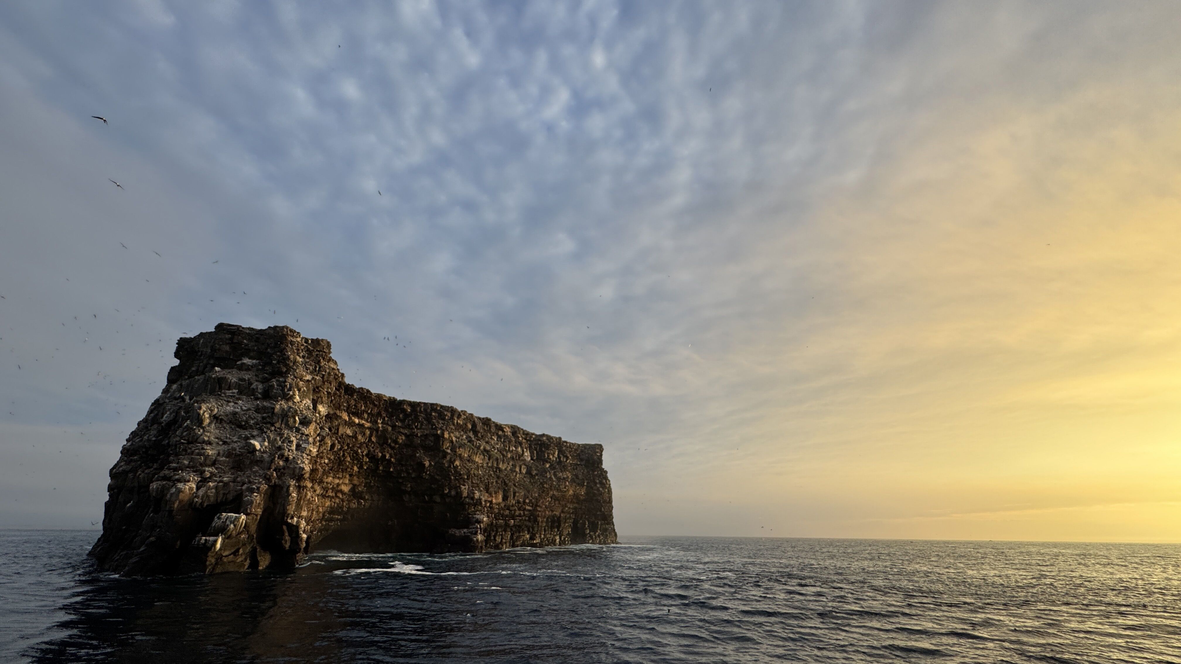 This morning, we embarked on a scenic hike at Punta Pitt, San Cristóbal Island, where we found all three booby species - red-footed, blue-footed, and Nazca. We also took a Zodiac ride along the rugged coastline for close-up views of dramatic cliffs, surrounded by seabirds and sea lions basking in the sun. In the afternoon, we kayaked around Cerro Brujo’s golden cliffs, followed by a relaxing stroll along its pristine white-sand beach. Some even enjoyed a refreshing swim in the turquoise waters. This perfect day ended with a cruise around Kicker Rock, lit in the golden light of sunset.