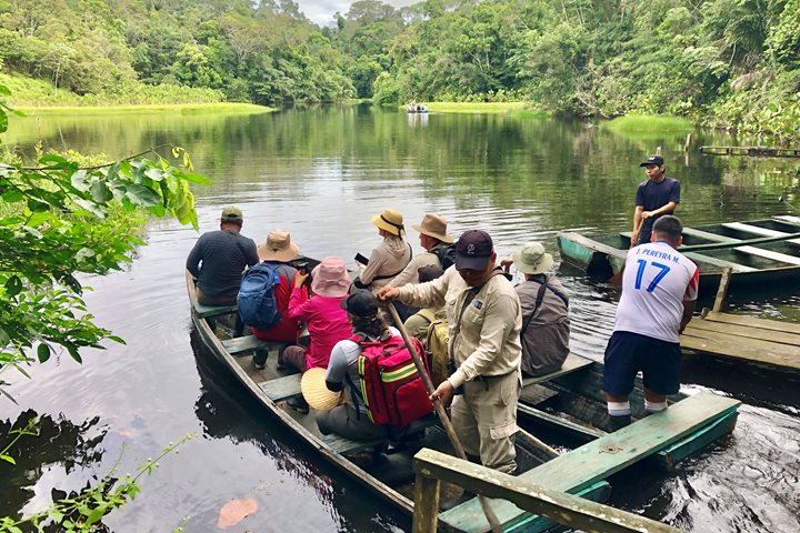 Our skiffs departed the ship after a heavy rain that delayed our plans a bit. Once the rain stopped, we enjoyed the fresh air on our faces as we traveled into the main river. Birds, monkeys, and lots of gigantic trees were bathed by a magic light coming through the clouds. It all made for great scenery. Suddenly, the rain came back just as we were finishing our skiff ride, so the timing was perfect as we returned to our lovely ship, the Delfin II.
