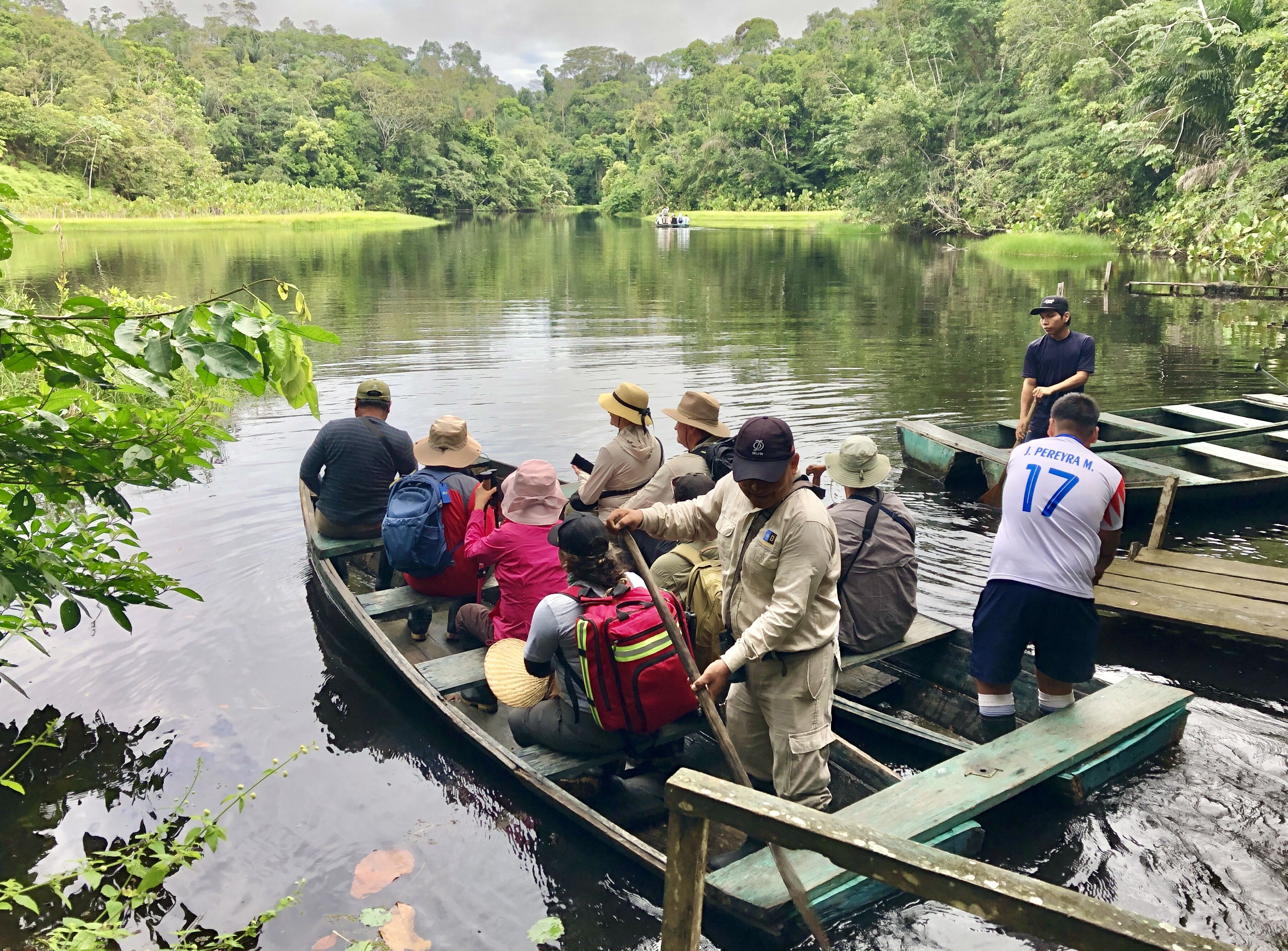 Our skiffs departed the ship after a heavy rain that delayed our plans a bit. Once the rain stopped, we enjoyed the fresh air on our faces as we traveled into the main river. Birds, monkeys, and lots of gigantic trees were bathed by a magic light coming through the clouds. It all made for great scenery. Suddenly, the rain came back just as we were finishing our skiff ride, so the timing was perfect as we returned to our lovely ship, the Delfin II.