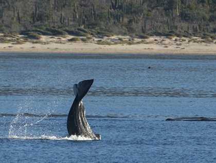 Our day started in a stunning way, with a couple of humpback whales throwing their tails up in the air and making big splashes, just in front of the gorgeous cliffs of El Mechudo range painted in pink tones by the first rays of the sun. We awakened to the new day at the south end of the San Jose channel, off the eastern side of the peninsula, and such an auspicious sighting was just the beginning of a great day. Shortly after leaving the humpbacks, we spotted something strange going on along the western side of San Jose Island; big splashes could be seen right on shore, just like when the surf crashes against the coast. However, there was no wind and the sea was completely flat. As we got closer and shapes began to be more clearly seen, we couldn’t be more surprised: a big group of sperm whales were enjoying themselves just a few yards from the beach! At least 27 individuals of all sized, including one big male, were logging at the surface and some of were lifting their flukes and tail stocks real high in the air and making the big splashes that we saw from far away.
