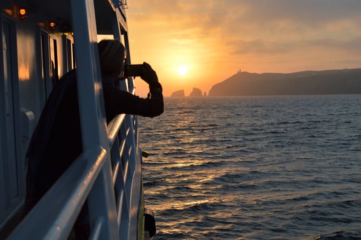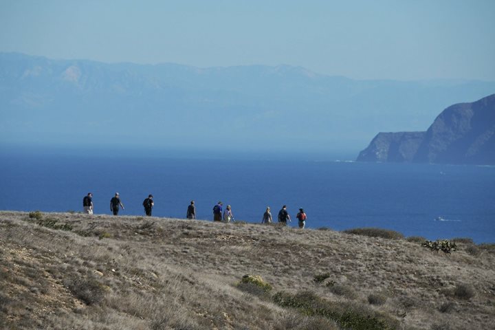 We awoke to the gentle rocking of the ship, behind the protected northeast bluff of Santa Rosa Island. We were anchored in Becher’s Bay, speculated to have been misnamed after explorer Sir Edward Belcher on coast guard maps since the 1800s. After a delicious breakfast, hikers took to the shore along a variety of trails. The ambitious among us took the long route to have lunch in the shade of the Torrey Pine grove , several miles down the island. Another group marched up through Cherry Canyon to take in the beautiful vistas above the bluffs of the beach. At the landing beach, hikers were able to roam the old settlement, with a meticulously preserved one-room schoolhouse, bright red barn, and livestock paddocks. A quick dip in the aqua blue ocean along the sandy beach was the perfect treat after hiking in the warm sun. After refueling ourselves with a delicious and hearty lunch, we pulled up anchor and headed to cruise along the northern shore of the islands. We were joined by several pods of common dolphins, who take much delight in riding on the wake of our bow. The ship also passed by thousands of pelagic cormorants flying close to the water’s surface, looking for a delicious meal. As we sipped our sangria and watched the sun set over the islands that we’ve explored over the past two days, we look forward to our next stop further to the south… Santa Catalina.