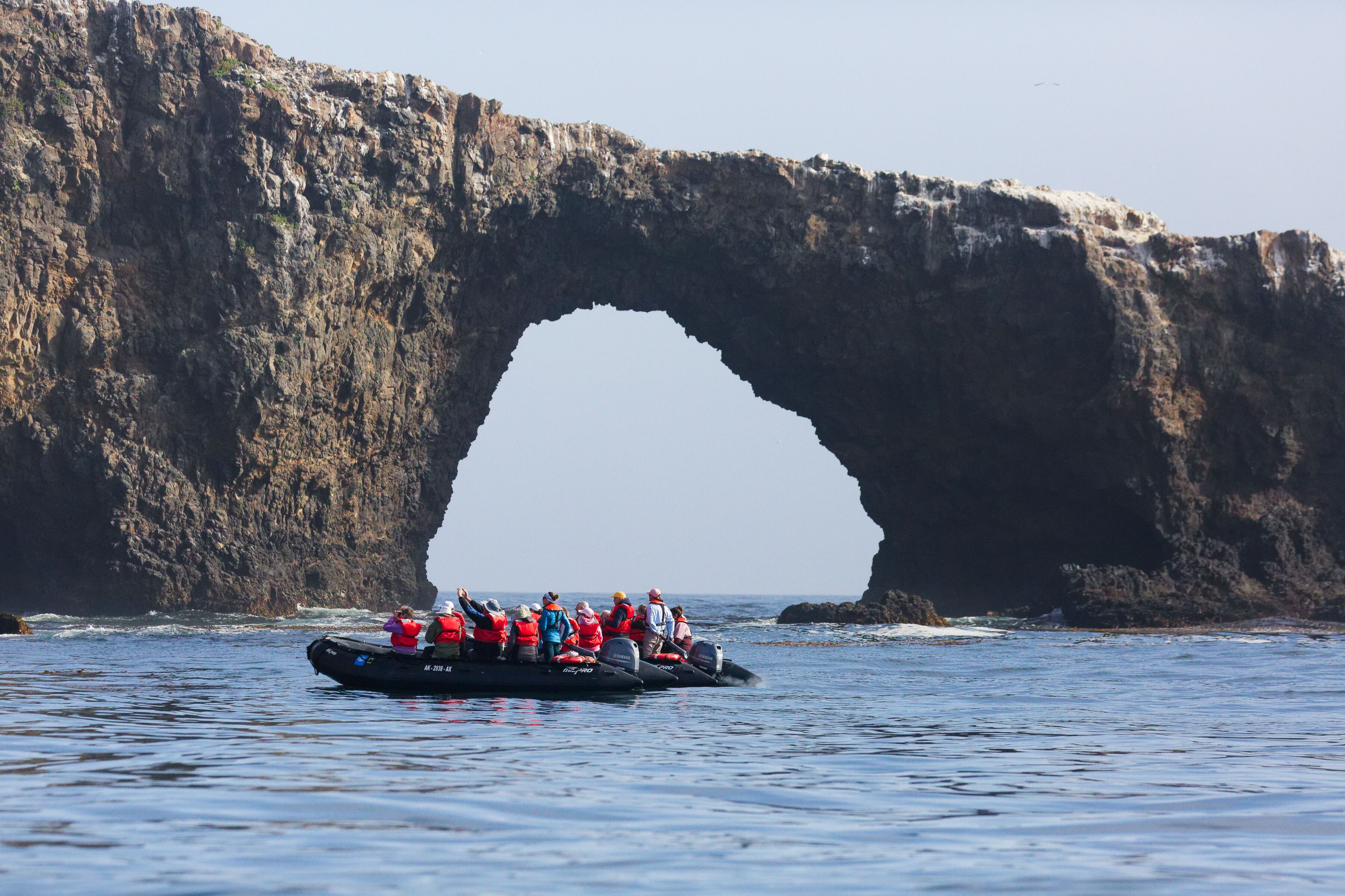 After exploring the island, we returned to the ship for lunch, during which time we repositioned to Anacapa Island, the second smallest Channel Island. We boarded Zodiacs to explore and were amazed at the California sea lions and brown pelicans feeding on bait balls all around us.