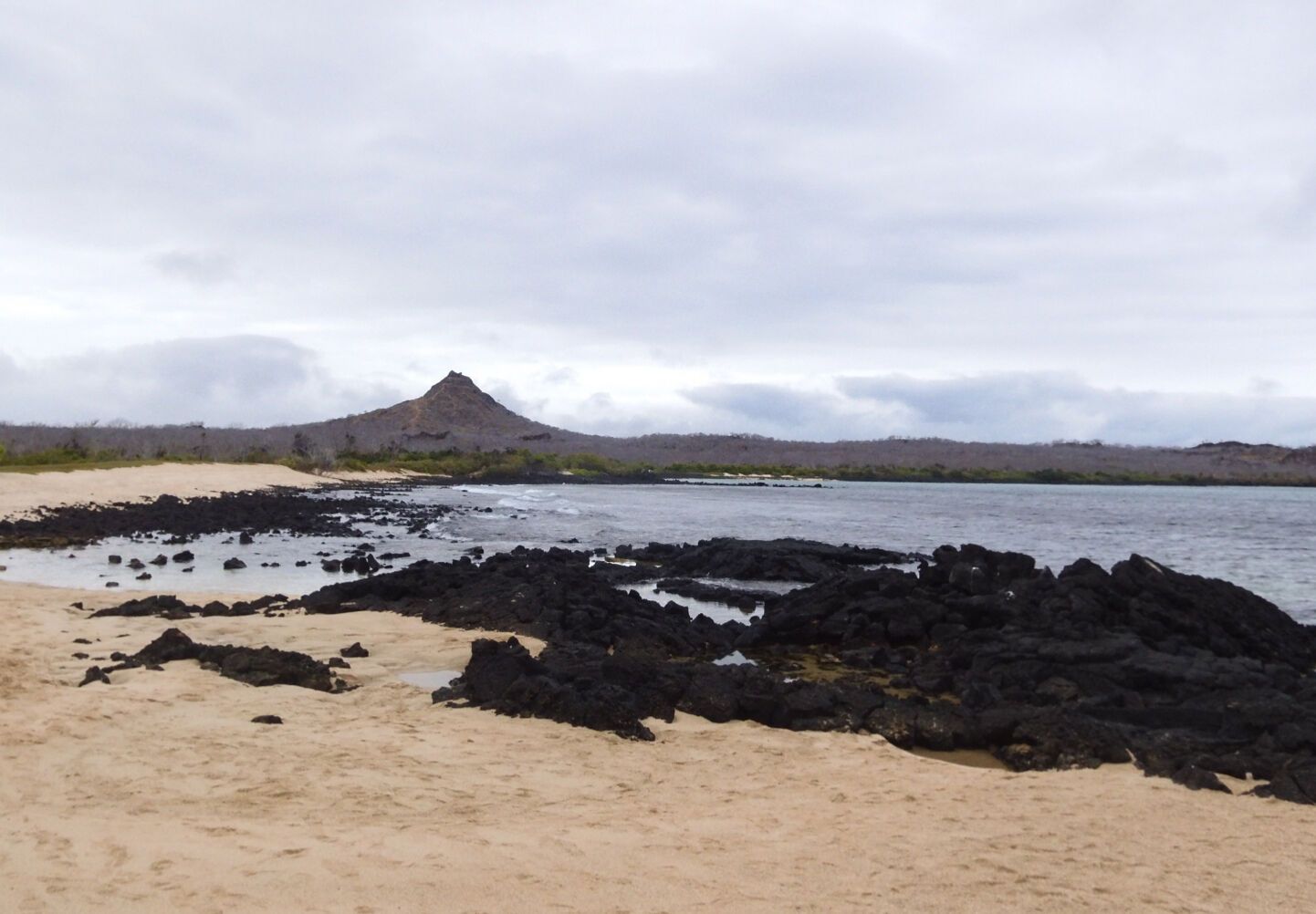 After the dinghy ride, we walked on Cerro Dragon, where we were welcomed by a couple of flamingos. One was a greater flamingo (Phoenicopterus ruber glyphorhynchus), an endemic subspecies in the Galapagos. The other was a Chilean flamingo (Phoenicopterus chilensis), which are occasionally found in the Galapagos. The wind was beautiful and refreshing. We passed by a dry forest of palo santo trees (Burseracea gravens) and prickly pear cactus (Opuntia echios gigantea). We also found leatherleaf and chaff flowers.
