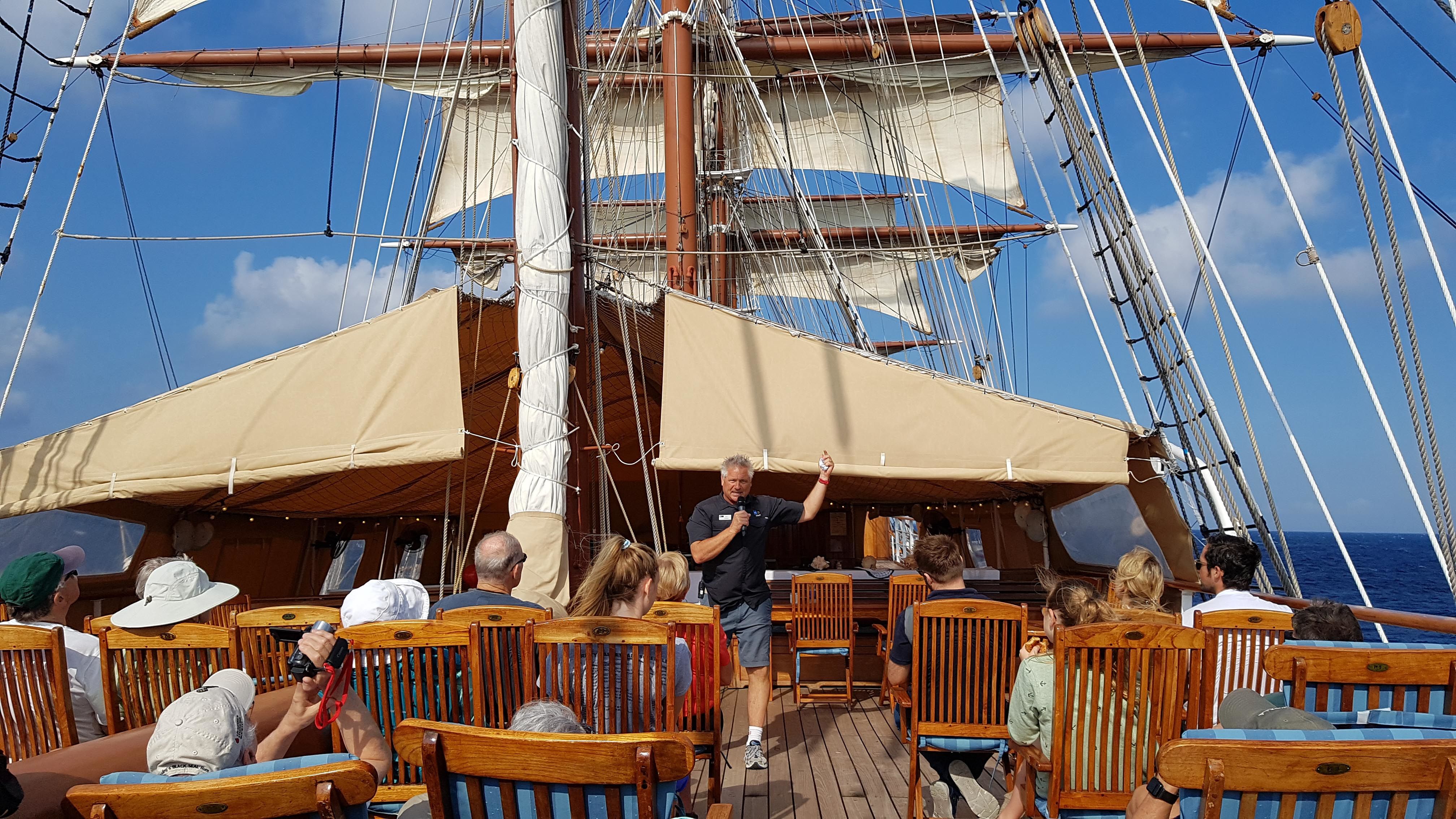 Back onboard for lunch, we were treated to a traditional Ecuadorian buffet, where we learned to eat ceviche as the locals do. Afterwards, we had the opportunity to do some kayaking around the area, allowing us to spot many pelicans, blue-footed boobies, lava gulls, and more. After dinner, the sky was clear and not over cast, so we had perfect conditions to see the constellations in the sky and sharks in the water!