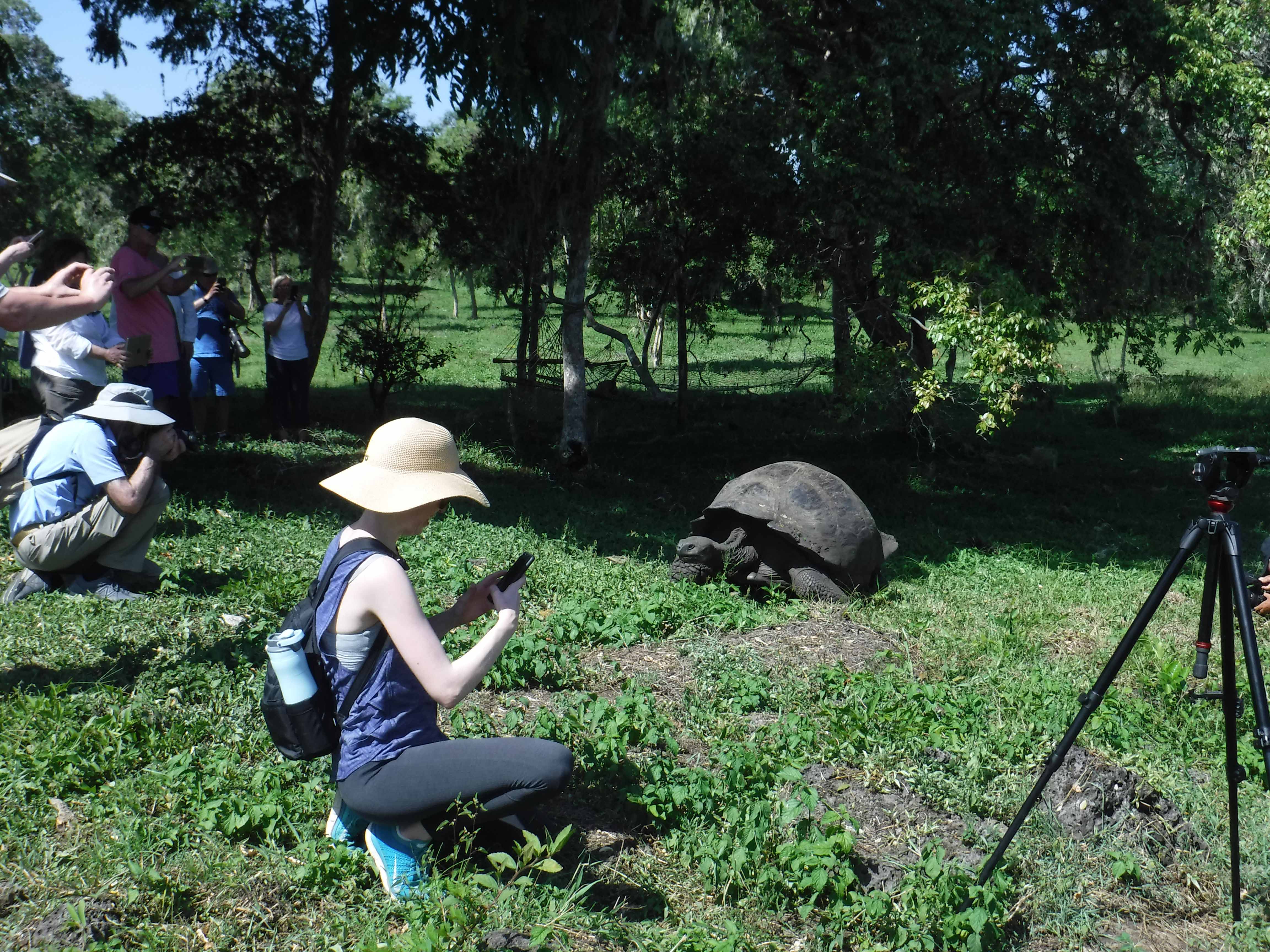 After a wonderful lunch at the local farm, we walked for about an hour and saw many tortoises of different sizes in the wild. These giants were wandering around a water pond and along the trails located in this forested area of the Island of Santa Cruz. It was wonderful to see them in their natural environment, where many of them have lived peacefully for years and years.