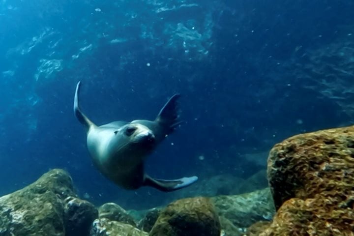 Right at the disembarkation beach, we were received by a large pod of friendly (shameless?) Galapagos sea lions. Some of the young ones were extremely curious and approached us closely. At least one guest was touched by their whiskers! We started to walk inland in search of the elusive Santa Fe land iguana, a nice-looking lizard that is endemic to this island only. It took some exploring to finally find the iguanas. Once we reached the embarkation beach at the very end of the walk, we observed evidence of the very recent delivery of a sea lion pup. Some mockingbirds vigorously pecked at the afterbirth. Just a few feet away, the mother and the newborn pup were talking to one another to imprint their voices. This will allow them to recognize each other even amongst large groups of sea lions.