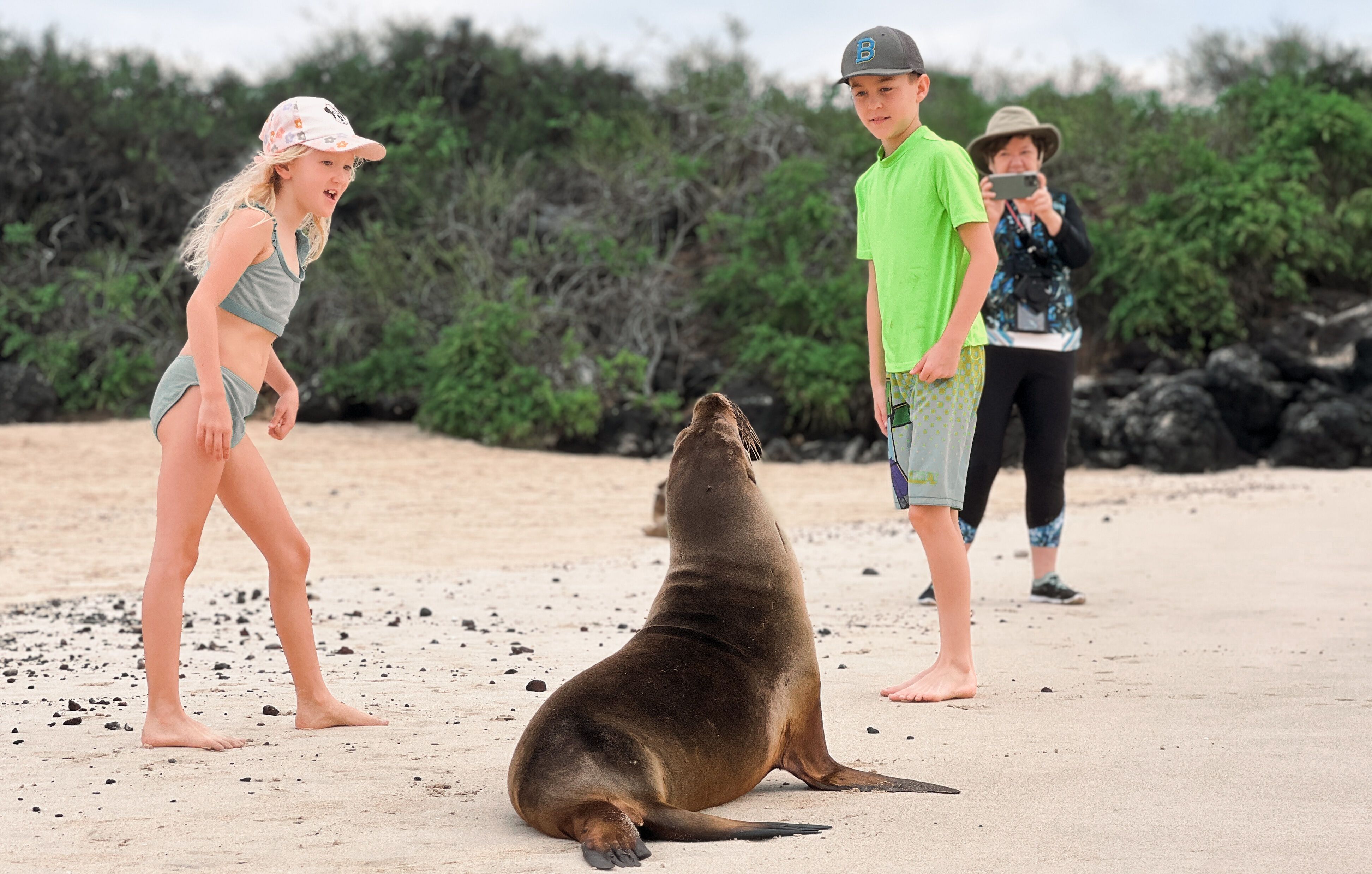 Sadly, our expedition aboard National Geographic Gemini is nearing its end. Our day began with a hike at the base of towering cliffs. A steep ascent led us to a plateau of a palo santo forest, sparse and otherworldly. Almost immediately, we were surrounded by red-footed boobies nesting in low trees and Nazca boobies on the ground. A highlight was spotting a short-eared owl perched silently among a lava crevice, camouflaged and hunting storm petrels. The calls of frigatebirds rang in the air, with their inflated red pouches on full display in a mating show. After our hike we enjoyed water activities, such as kayaking along the cliffs and snorkeling. In the late afternoon, we landed on the coral sand beach of Darwin Bay. Guests enjoyed a relaxing stroll along the shoreline bordered by mangroves and nesting bird colonies. The presence of swallow-tailed gulls, lava herons, and marine iguanas provided excellent photo opportunities.