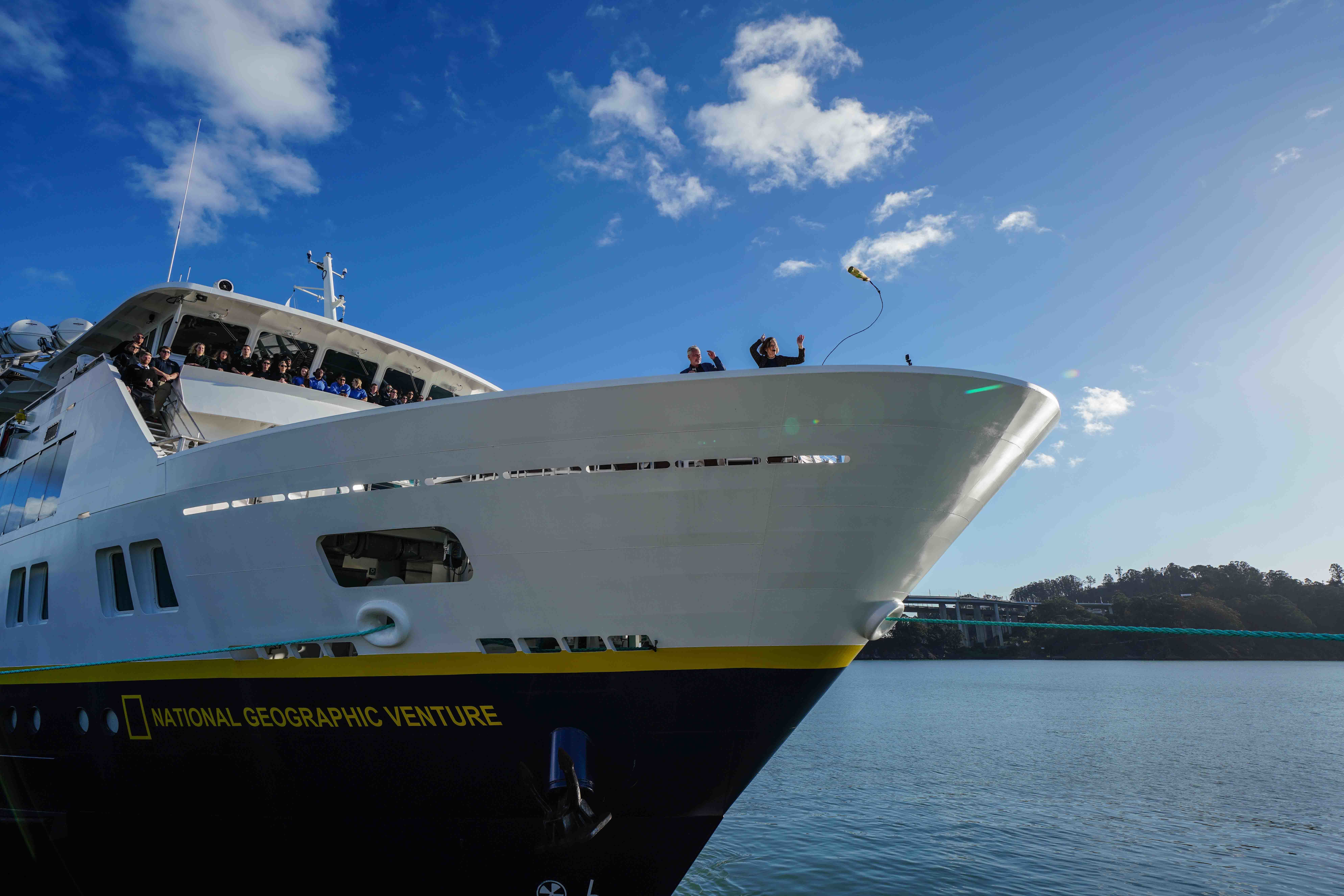 Guests gathered under the Bay Bridge, and alongside the skyline of San Francisco, ready to celebrate the inauguration of National Geographic Venture , Lindblad Expedition’s newest ship in the fleet. The ship will explore the western coast of North America, sailing to Alaska, Baja, the Pacific Northwest, and Coastal California. With the ceremonial bottle of champagne smashed along her bow, the ship is now ready to explore the San Francisco Bay and beyond.