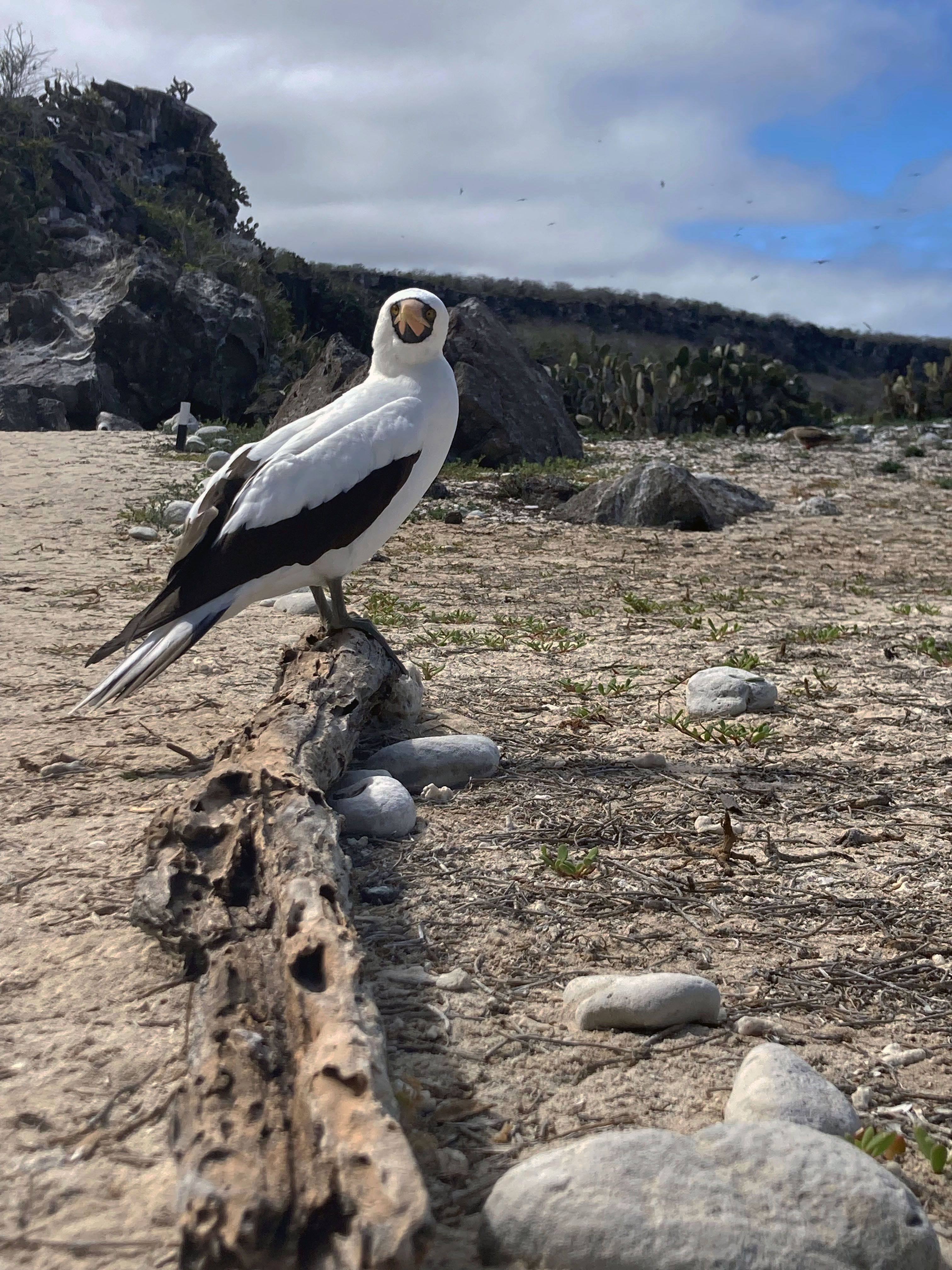 After breakfast, we boarded Zodiacs and kayaks to explore the surroundings of Chinese Hat. The wind was blowing strongly, and the ocean looked completely turquoise and transparent, making it possible to observe the ocean floor and even some sharks and sea turtles swimming near the coast. We passed close to the coral beach, where American oystercatchers and whimbrels strolled indifferently near sea lions. Observing Santiago Island from across the channel, its landscape changed drastically. We observed immense fields of completely black lava that looked sterile without vegetation. These fields contrasted with the green vegetation of the island’s highlands. It was here that we spotted some Galapagos penguins leaving their nests, getting ready to start their daily routine of foraging. Their white plumage makes them easily identifiable from a distance. Due to their meekness, we were able to get close enough for guests to photograph them.
