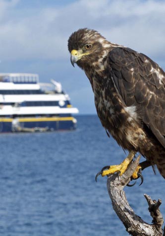 This Island has one of the most successful eradication programs carried on by the Galapagos National Park Service, and that is the reason we offered a pre-breakfast morning activity to take full advantage of this majestic island. One group was sent out for kayaking along the coast of a very well-known historical place known as Buccaneer Cove. With lots of sea birds and our two endemic Galapagos sea lions, another group was sent out for a fast paced walked along the interior with dense vegetation and hundreds of male finches singing to attract a mate. They are taking advantage of the good conditions for breeding. A last group decided to disembark and walked a mile along the black sandy beach with thousands of turtle’s nests. The nesting season is almost over but lucky enough we saw a Pacific green sea turtle finishing covering its eggs. It was a very well deserved sighting for our early risers. Galapagos hawks came very close as we were embarking the Zodiacs to come back on board.