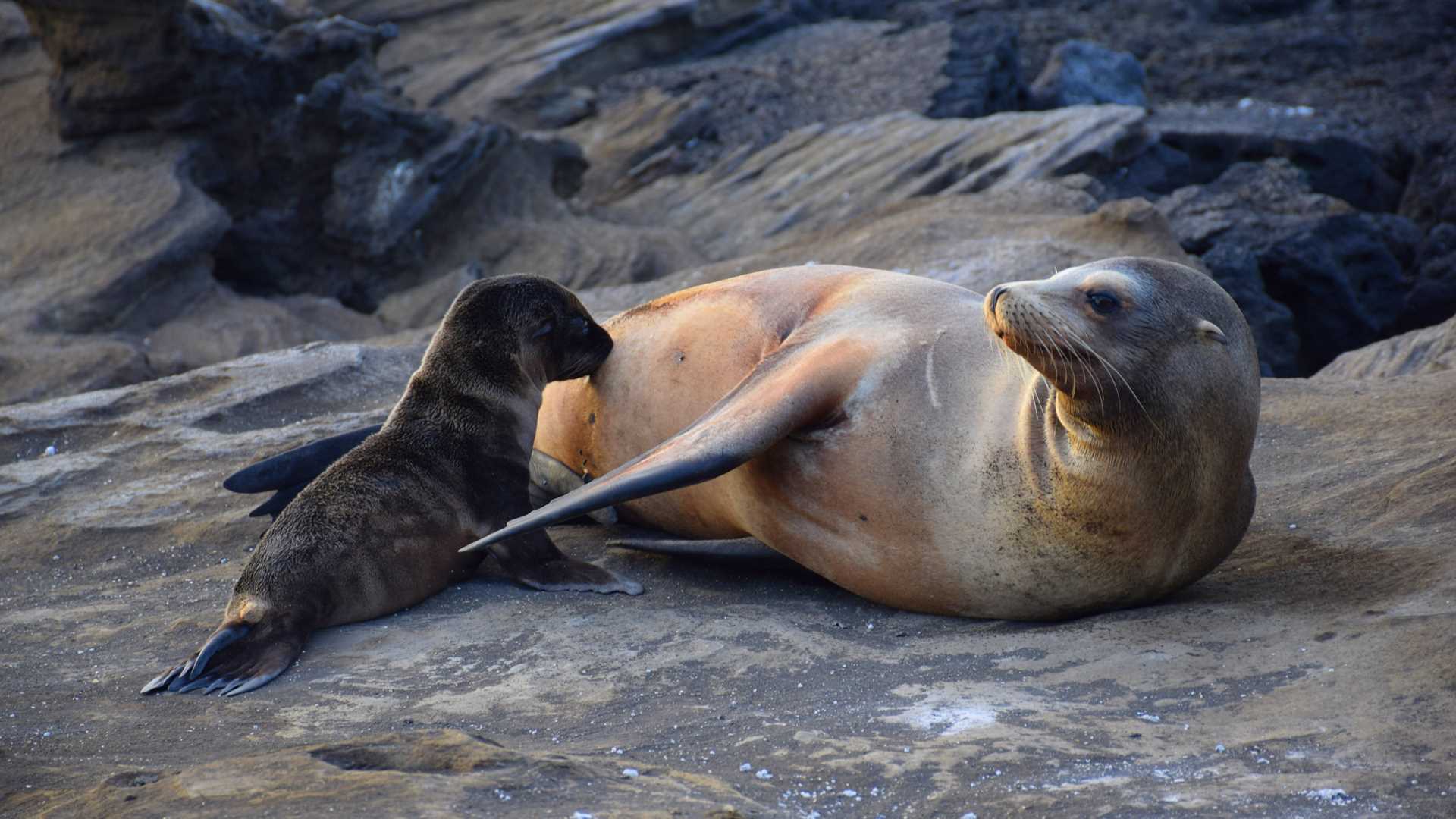 During lunch we moved to anchor at Puerto Egas. After another wet landing in the Zodiacs, we had a choice between a hike along the shoreline to look for marine iguanas, sea lions and fur seals, or to relax on the beach and have a swim or snorkel from shore. On the hike we followed the coastline and were treated to marine iguanas, Sally Lightfoot crabs, Galapagos fur seals and sea lions. As the sun was setting, the lighting was perfect for photographs as we walked over the rough, lava shoreline. A highlight was a mother sea lion suckling her pup, probably only a week or so old. We stopped to watch the sunset behind the volcanoes of Isabella in the distance.